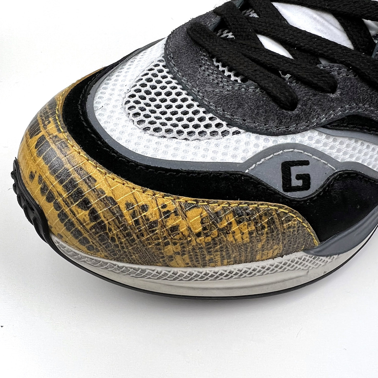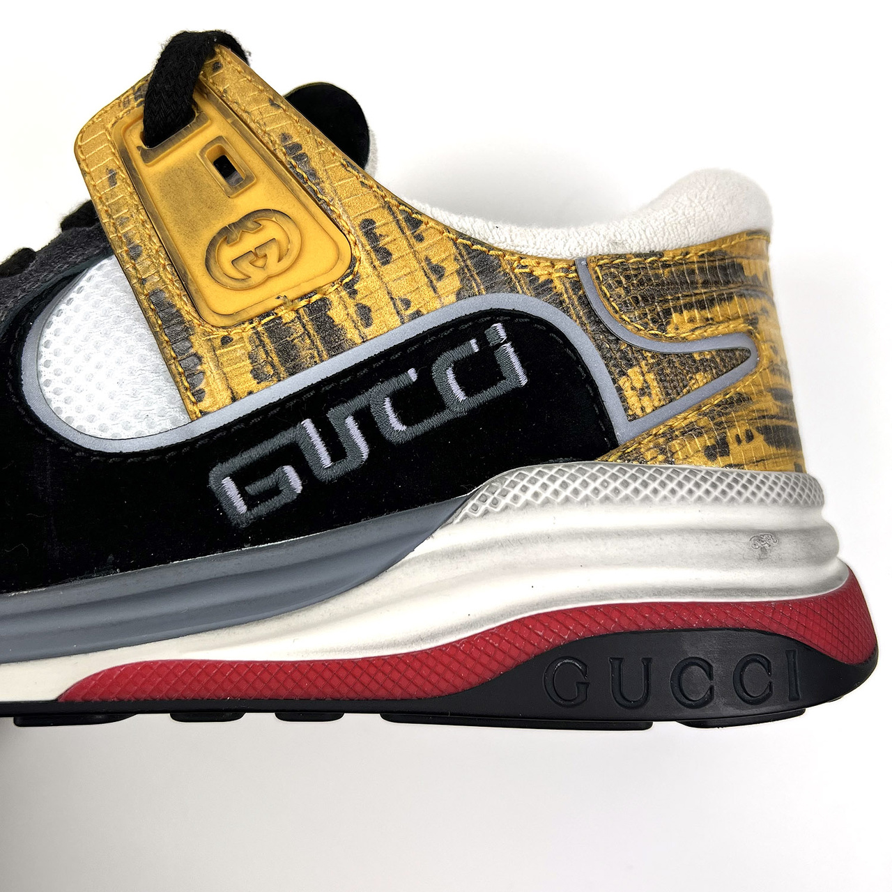 "В этой версии знаковых для марки мужских кроссовках Ultrapace дизайнеры Gucci процитировали стилистические элементы из архивных и современных дизайн-кодов марки, а также использовал в оформлении разные вариации эмблемы Gucci: от логотипа в шрифтах 90-х годов, до классической GG-монограммы. Для изготовления модели мастера бренда использовали комбинацию сетчатого текстиля, замши и текстурированной кожи с состаренным эффектом."