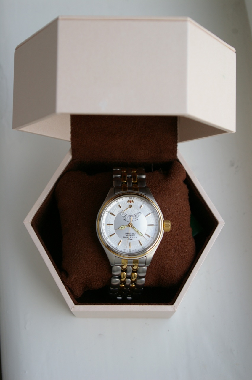 Я решил сделать себе подарок к 30-тилетию. Искал часы долго, мучительно, перебирая различные варианты. Меняя предпочтения, надоедая вопросами вам, форумчанам. И вот однажды в одной из тем я увидел зеленого Альпиниста от Сейко. Мне сразу понравилась эта модель: ее лаконичные формы, стрелочки винтажные. Но изучив вопрос и поняв, что их цена для меня не приподъемна, я подумал, что эти часы не для меня. И тут я вспомнил, что однажды скачал каталог коллекции Neo Classical Elegance от Ориент, отсканированный уважаемым AlexSan^ом. На картинках эти часы мне очень напомнили Альпиниста. Но я понимал, что это все-таки разные стили. Тем не менее, часы от Ориента мне приглянулись. Но меня ждало разочарование - оказалось, что эта коллекция снята с производства около 10-ти лет назад. Я поинтересовался на форуме - нет ли у кого ссылок на продажи этих часов, или может у кого-то есть желание их продать. Akopovich порекомендовал мне обратиться к Andy65, мол он совсем недавно продавал. Как выяснилось, продал. Но он обещал мне попытаться найти еще. Да я и сам не собирался сидеть на месте. Писал в Японию в Ориент, писал в Малайзию, представителю магазина, в котором эта модель значилась (но на деле оказалось, что они ее давно продали), Сейе, Хигучи. Все без толку. И вот однажды, когда я совсем было отчаялся и уже создал тему по поиску новых часов, вдруг выскочило личное сообщение от drill. Он писал, что в одном часовом магазине нашел искомые мною часы. У меня клавиатура выпала из рук. И пошло поехало, бесконечные переписки, беспокойство, ожидание. И вот они у меня. Я хотел, правда, в стали без позолоты, но в данном случае выбирать не приходится. И эти часы мне нравятся безумно. Итак, они примерно 37 мм в диаметре вместе с заводной головкой. Циферблат то ли перламутровый, то ли "под металл". Мелких деталей множество, но время считывается легко и быстро. Нет ни дня недели, ни даты, только индикатор запаса хода и две стрелки. Маятник автоподзавода - с покрытием. Часы довольно толстые, но изящные. На руку легли без проблем, размер классический. Браслет литой из стали. Съемные звенья на маленьких болтиках. Попытался установить точность хода. В первый день, как завел, убежали, причем довольно прилично, как мне показалось, на 1 минуту. Но завел я их не полностью, только ровно на сутки. Сегодня на все 40 часов завел. Посмотрим, что будет. Хотя, чтобы ни было - мне они все равно нравятся. Простите, что написал очень много. Просто хотелось поделиться чувствами и поблагодарить хороших людей.