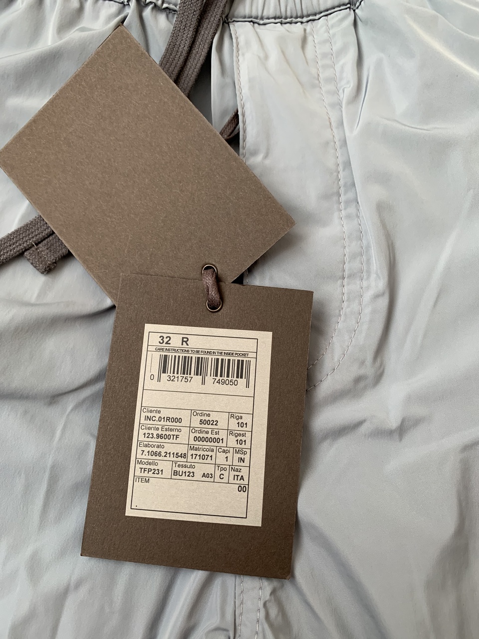 Брюки изготовлены из быстросохнущей нейлоновой ткани,что позволяет не сковывать движения при ходьбе и занятиях спортом.Пояс с резинкой регулируется с помощью шнурка,внизу брючин металические молнии с крупным брендированным бегунком.Боковые,прорезные карманы спереди,накладные карманы сзади имеют застёжку на пуговицы-клёпки с логотипом дизайнера.