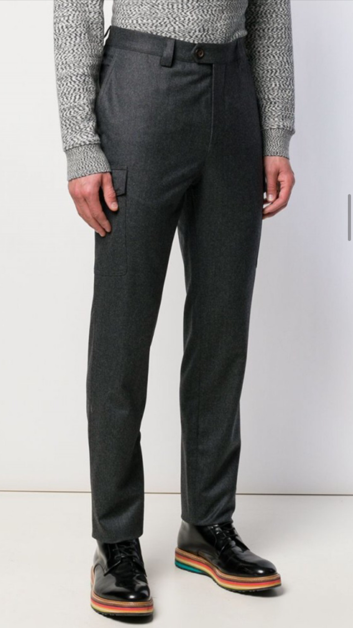 Традиционный характер фланели из натуральной шерсти сочетается с современным видом широких карманов карго по сторонам брючин. Мягкая классическая фланель обеспечивает комфорт, тепло и элегантность. Свободный зауженный крой отличается мягкими формами в области бедер, слегка заниженной линией талии и облегающими брючинами. Застежка на молнию с пуговицей, металлическим крючком и подпуговицей.