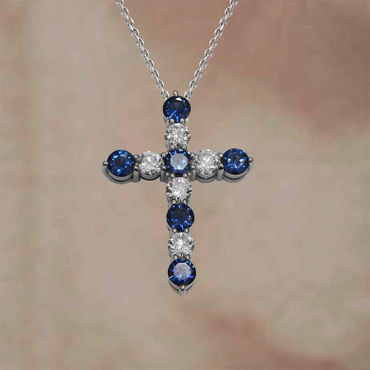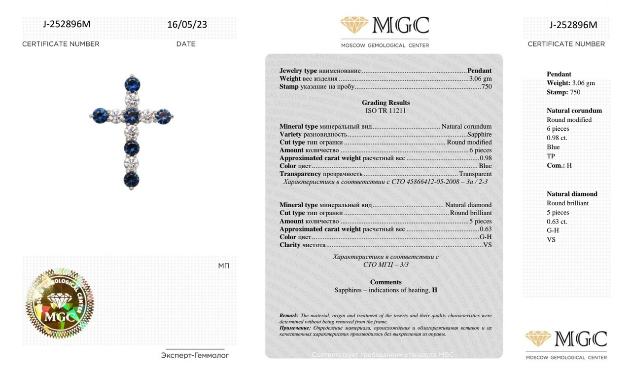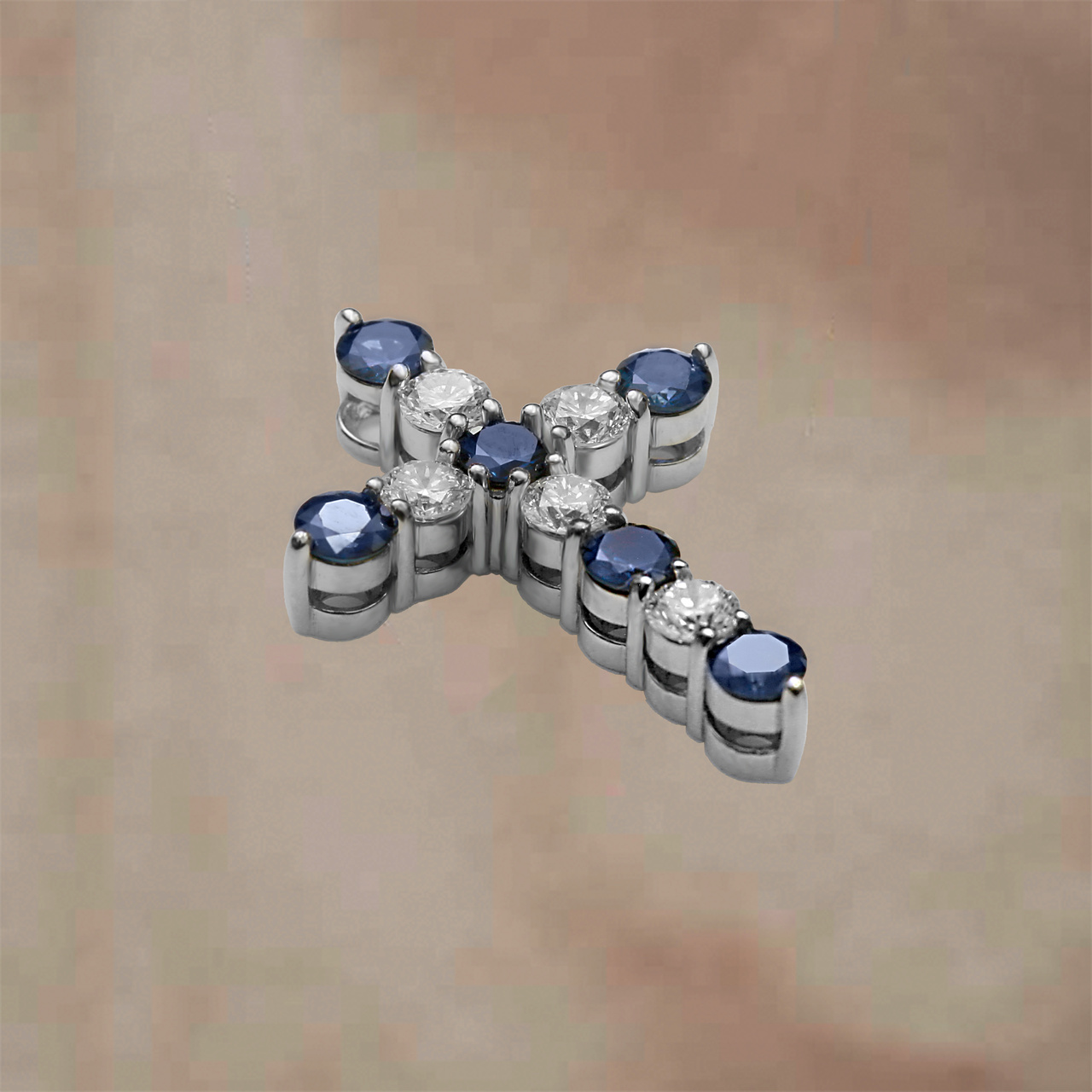 Подвеска-крест из белого золота с сапфирами 0,98 карат и бриллиантами 0,63 карат (сертификат МГЦ)