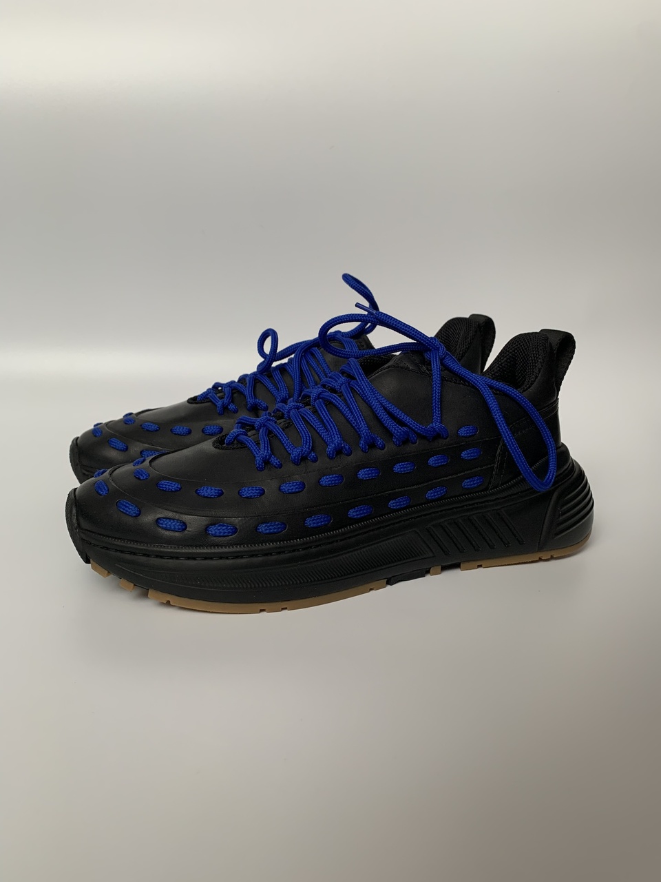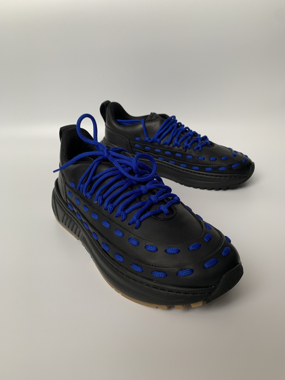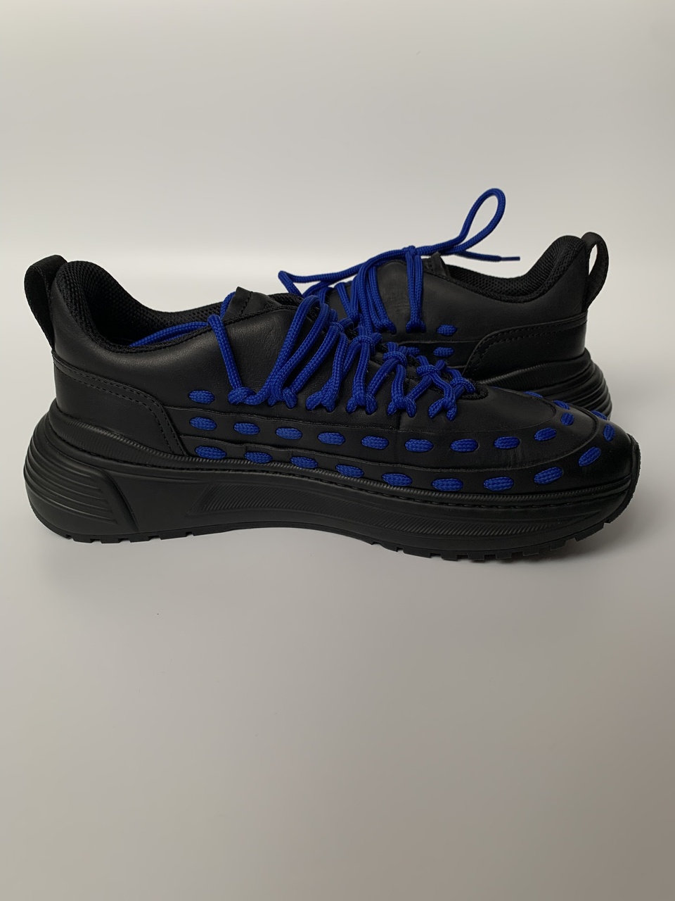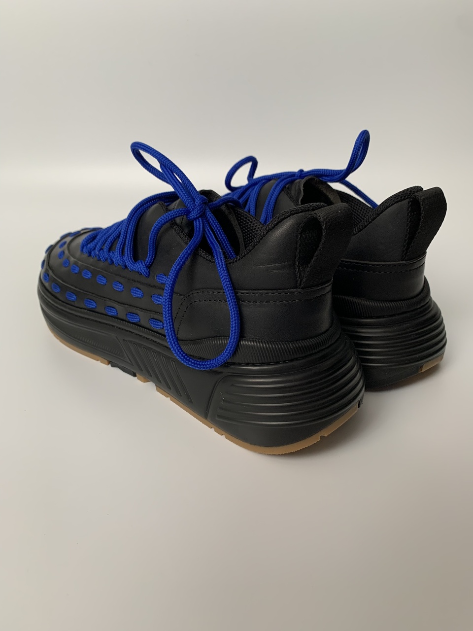 Чёрные кроссовки не выглядят просто благодаря шнуровке оттенка синий электрик и двойному стичингу ей в тон.Обувь изготовили из гладкой матовой кожи растительного дубления,поэтому она получилась особенно мягкой и эластичной.