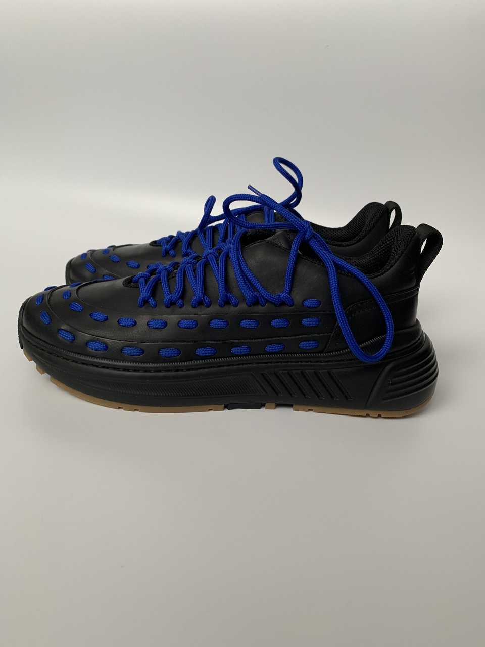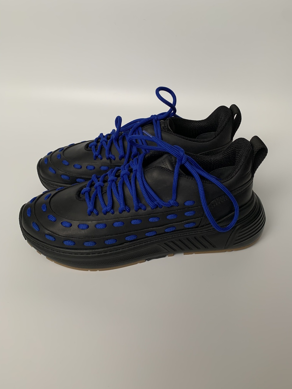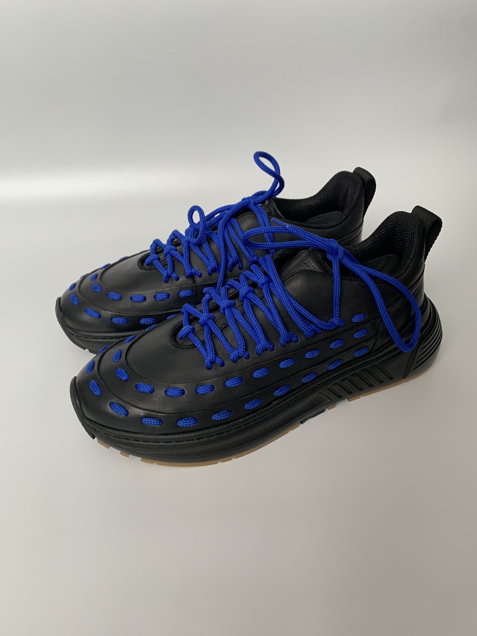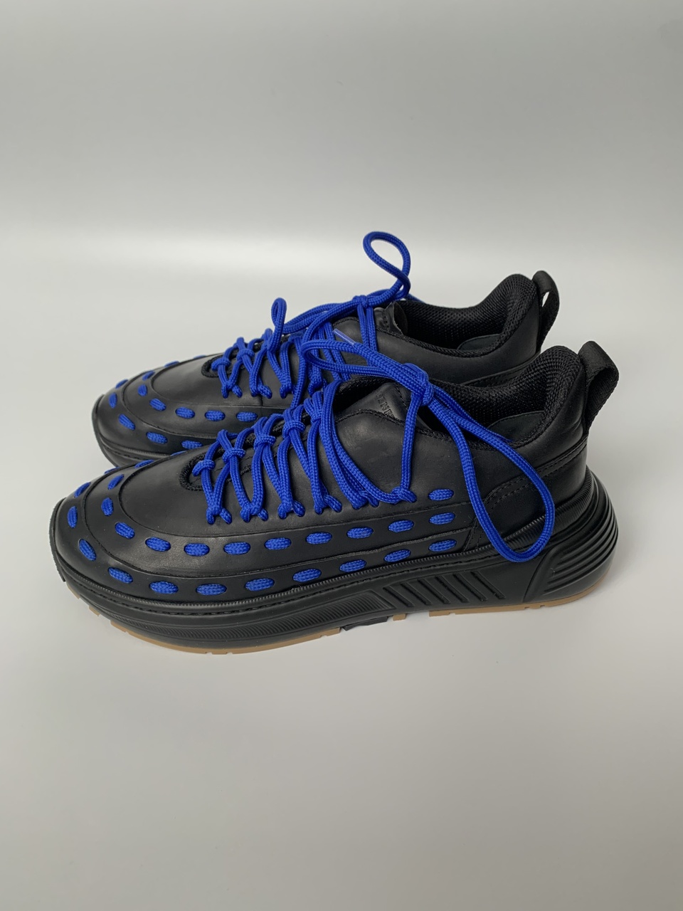 Чёрные кроссовки не выглядят просто благодаря шнуровке оттенка синий электрик и двойному стичингу ей в тон.Обувь изготовили из гладкой матовой кожи растительного дубления,поэтому она получилась особенно мягкой и эластичной.