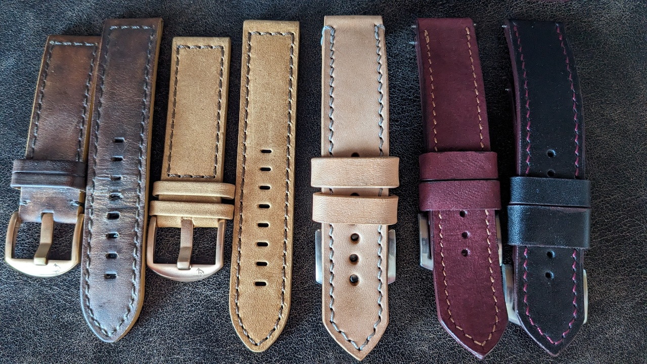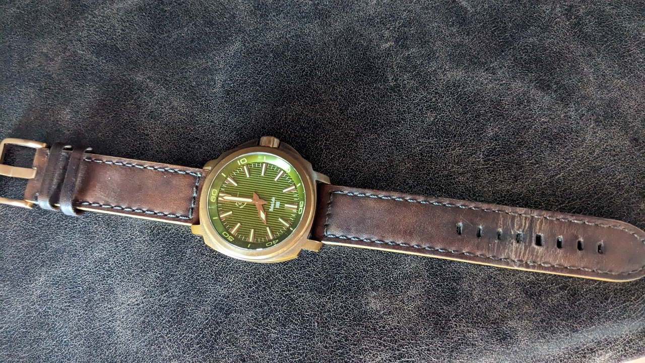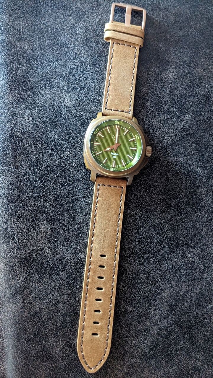 По комплекту: сами часы, родной мягкий тревел-кейс на молнии, два оригинальных ремешка(светлый абсолютно новый, тёмный надевал раз 5-7 от силы) с оригинальными баклями(скорее всего латунь)+ оригинальная бронзовая бакля. Дополнительно три новых ремешка ручной работы на все случаи жизни и на смену настроения и внешнего вида часов+ новый кожаный чехол ручной работы. Комплект реально хороший получился.