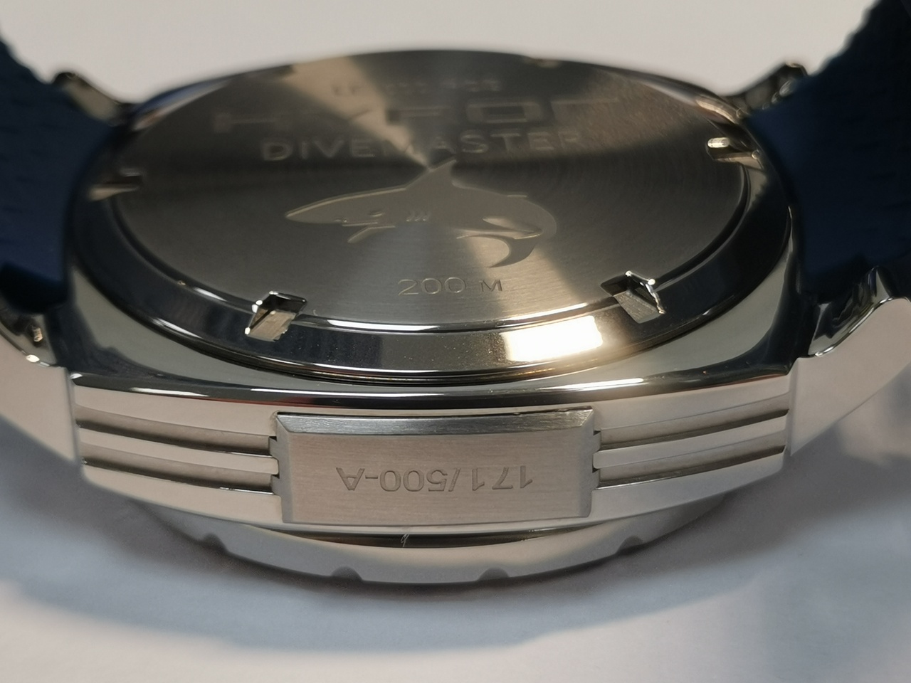Задняя крышка завинчивающаяся, плоская, слегка приподнятая. Наклонная фаска полирована, основное поле крышки сатинировано. На крышке имеются гравированные надписи: LE 500 PCS, HYRON, Divemaster, изображение акулы, 200 m.