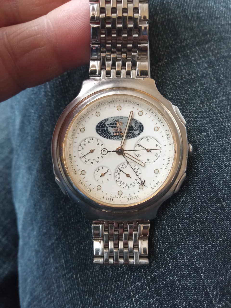 Прошу подсказать что-нибудь по данному экземпляру - оригинальность, алгоритм настройки и пр. Методом тыка разбираться до поры до времени было интересно, но поднадоело. Все варанты, которые приходили в голову, проверены. Часы на ходу, точные, но, по неизвестной причине, маленькая часовая стрелка не двигается, и, соответственно, не переводится календарь. Хотя найдена комбинация положения переводной головки и нажатия кнопок, которая позволяет установить и еë, и указатели месяца и числа. Найдена комбинация, когда стрелка указателя часового пояса двигается в режиме секундной стрелки, но против обычного движения,описывая круг, приблизительно,за 20 секуно... Вот... Как-то так