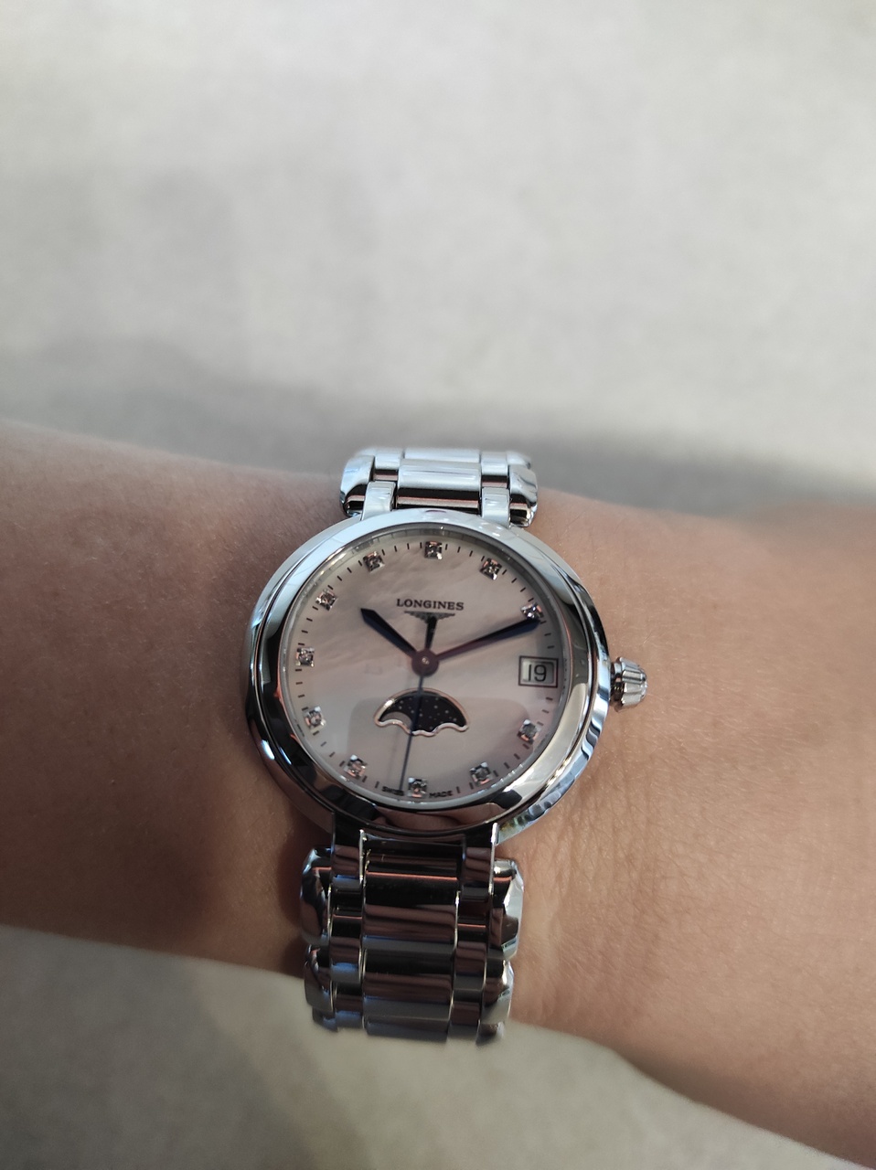 Оптимальный размер 30 мм, синие стрелки на белом перламутровом циферблате смотрятся очень красиво и стильно, 11 бриллиантов группы Top Wesselton VS-SI общим весом 0.044 карата добавляют некоторой роскоши этим часам.