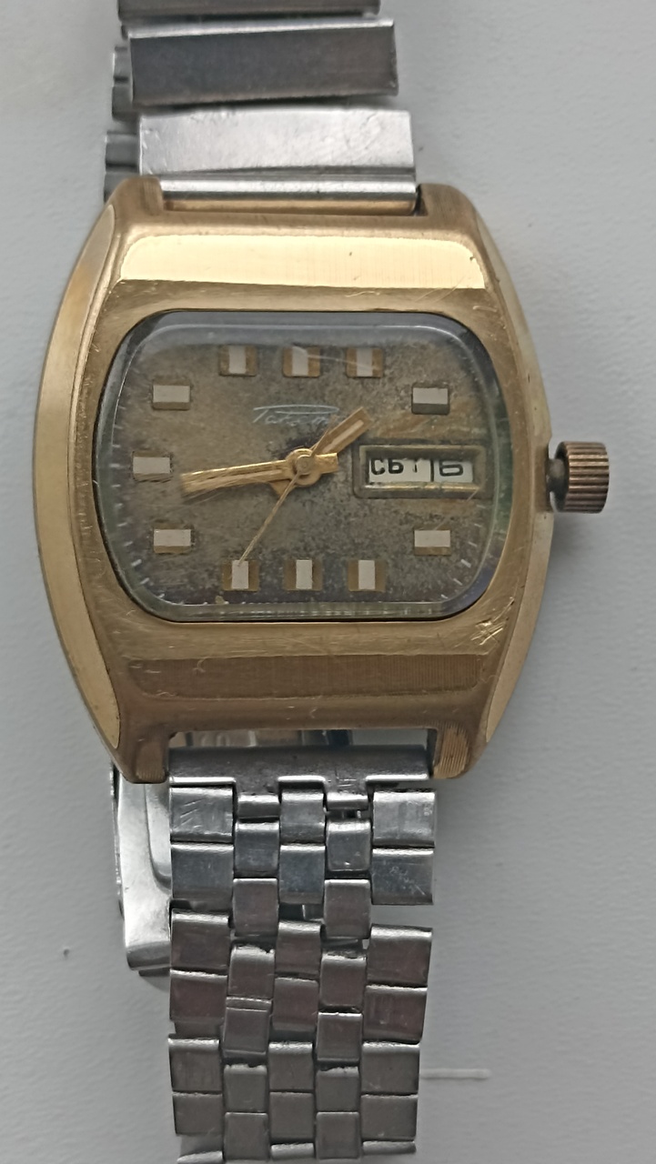 Часы интересные, с историей, их было выпущено большое колличество разных вариантов исполнения. Я себе несколько штук оставил в коллекцию, двое продал, не в позолоте. Одни сейчас в продаже, примерно в таком же сохране, на ходу - 1500 и желающих пока нет.