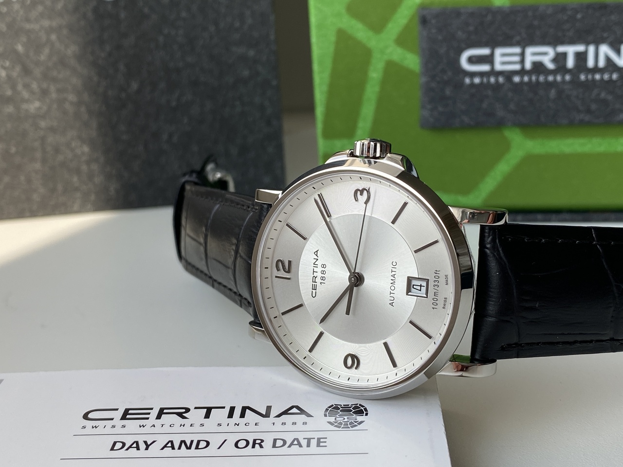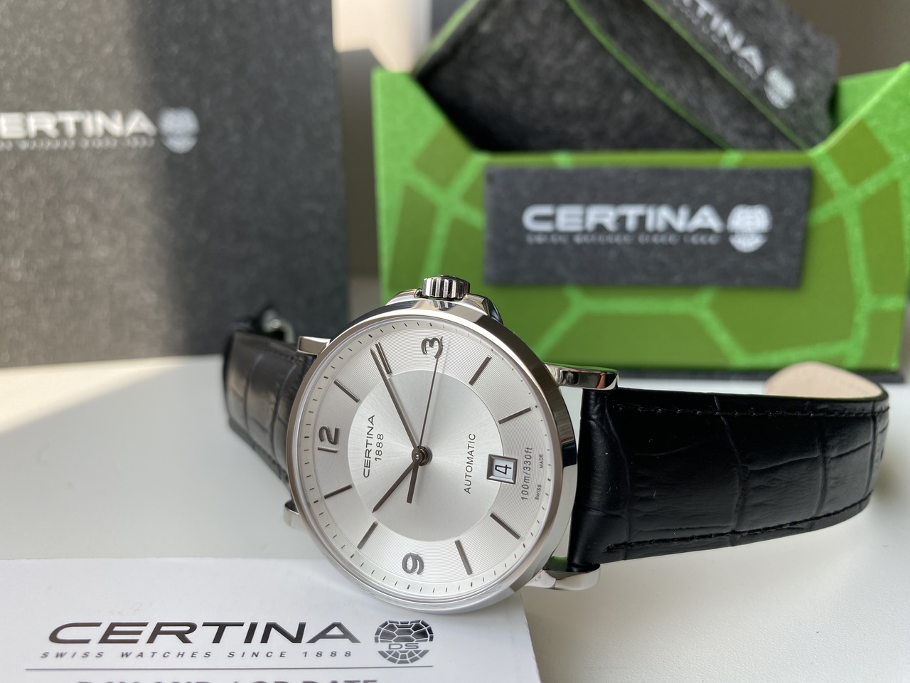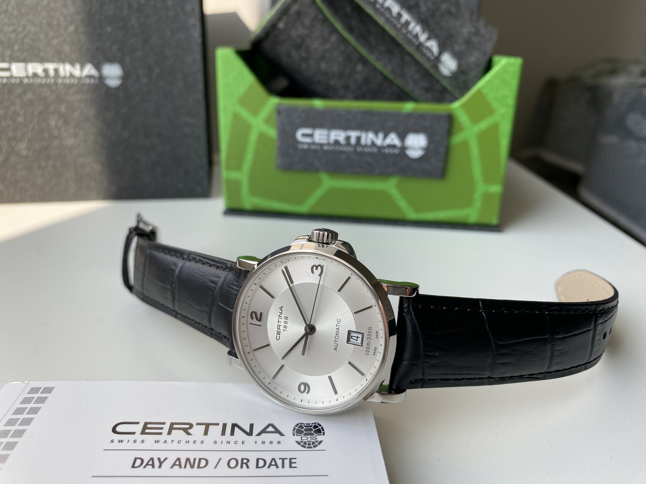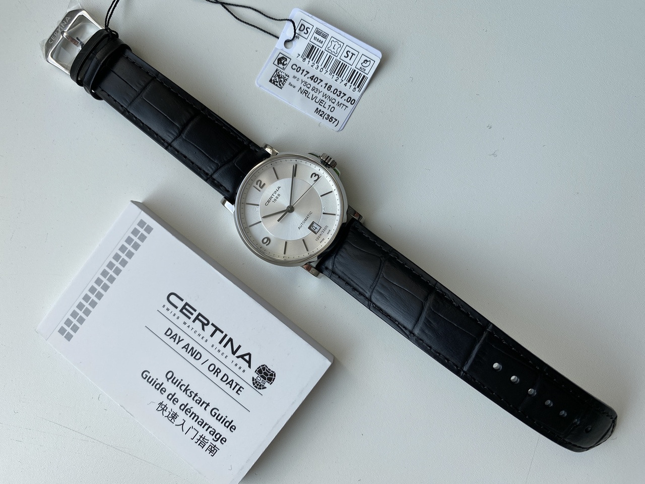 Традиционно для Сертины - хорошая отделка, отдельного упоминания заслуживает хорошей прозрачности стекло и циферблат концентрицеского гильоширования с накладными метками.