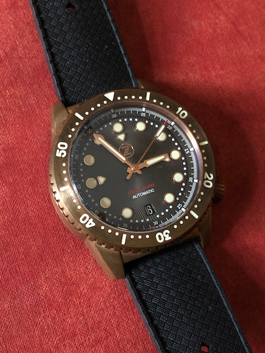 Корпус из "правильной" бронзы CuSn8 (40х46х13.5 мм) с равномерным естественным патинированием, ширина ремешка 20 мм, хорошо садятся на небольшую руку.