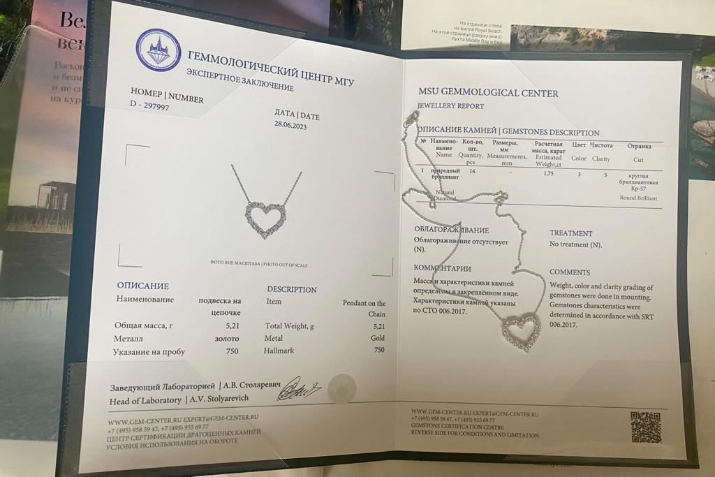 КОЛЬЕ С БРИЛЛИАНТАМИ "СЕРДЦЕ" 1,75 карата (аттестат МГУ)!