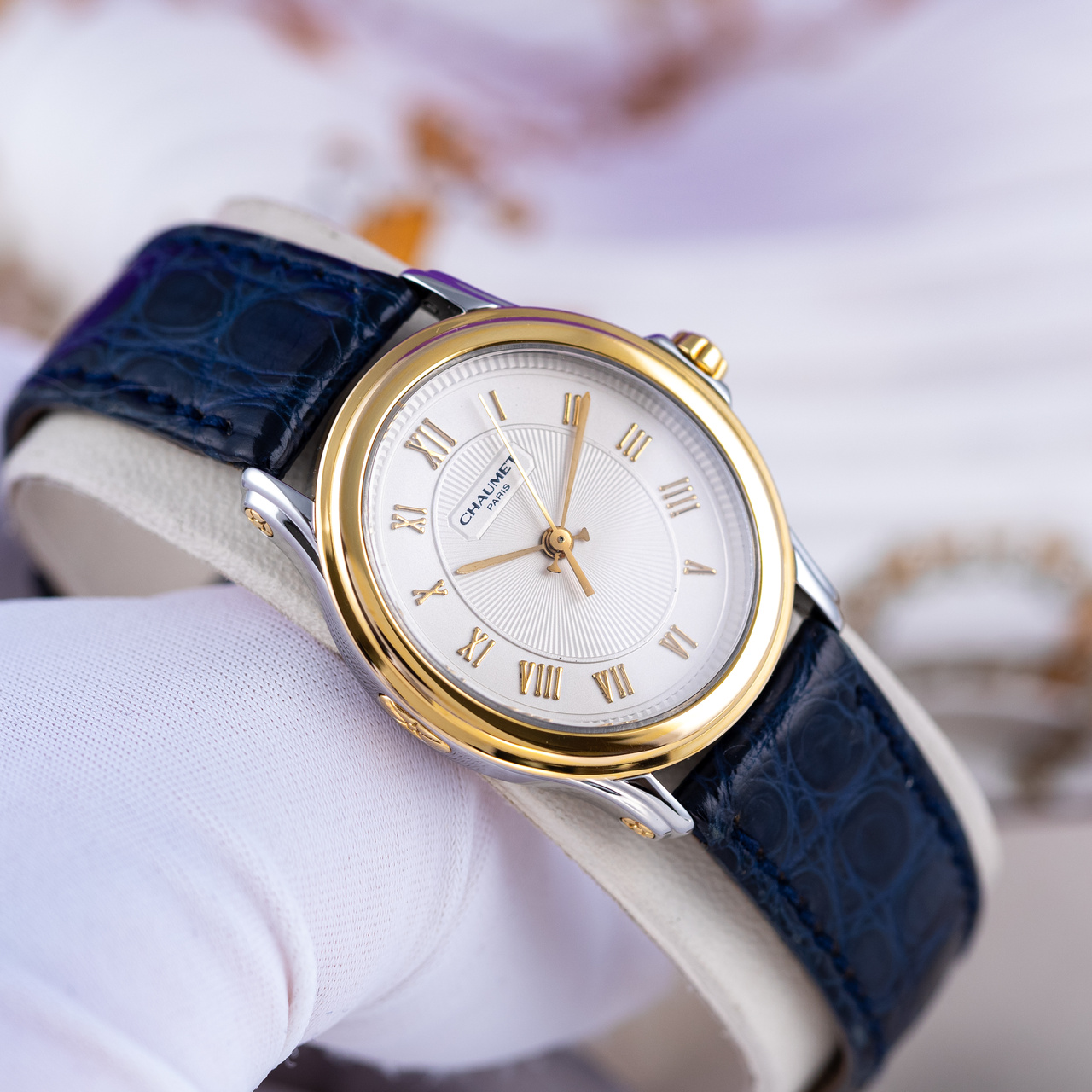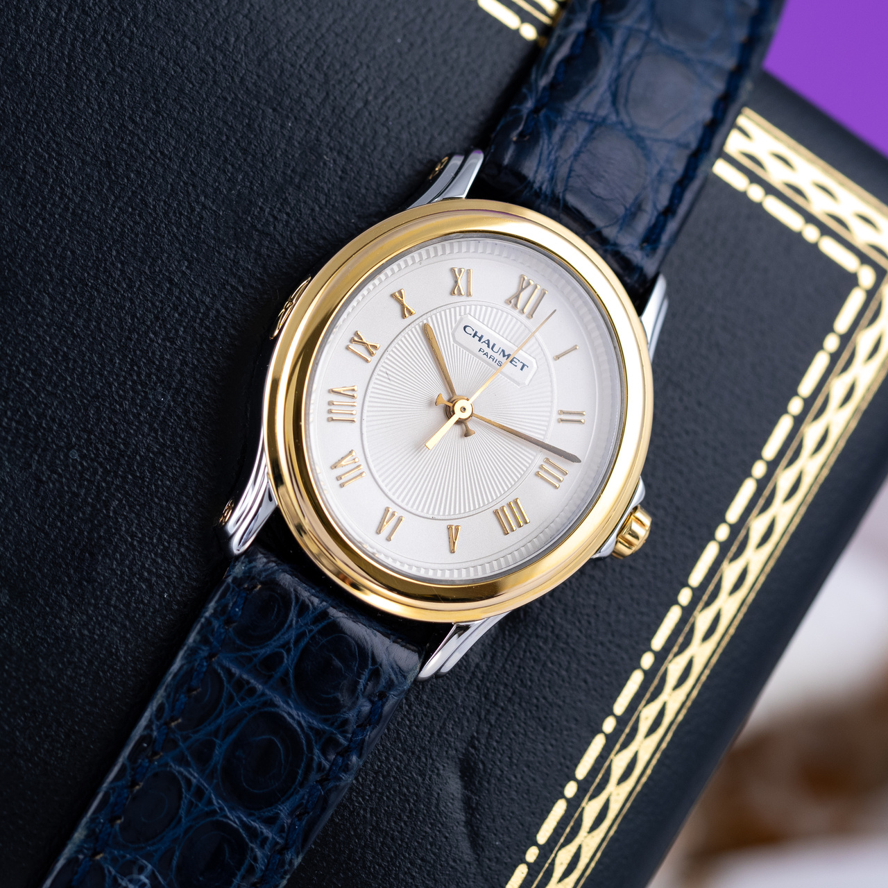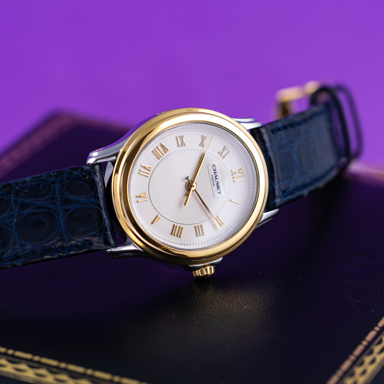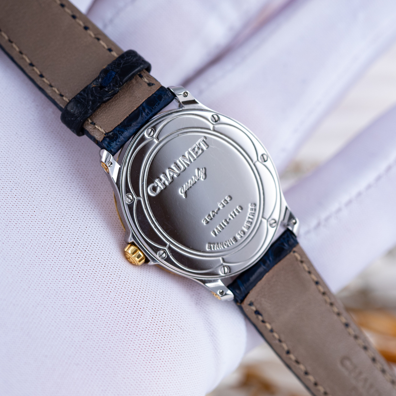 Ширина корпуса: 26 мм (не считая заводную головку). Оригинальные ремешок и застежка Сhаumеt(б.у.). Дополнительно прикладываем неродной ремешок.