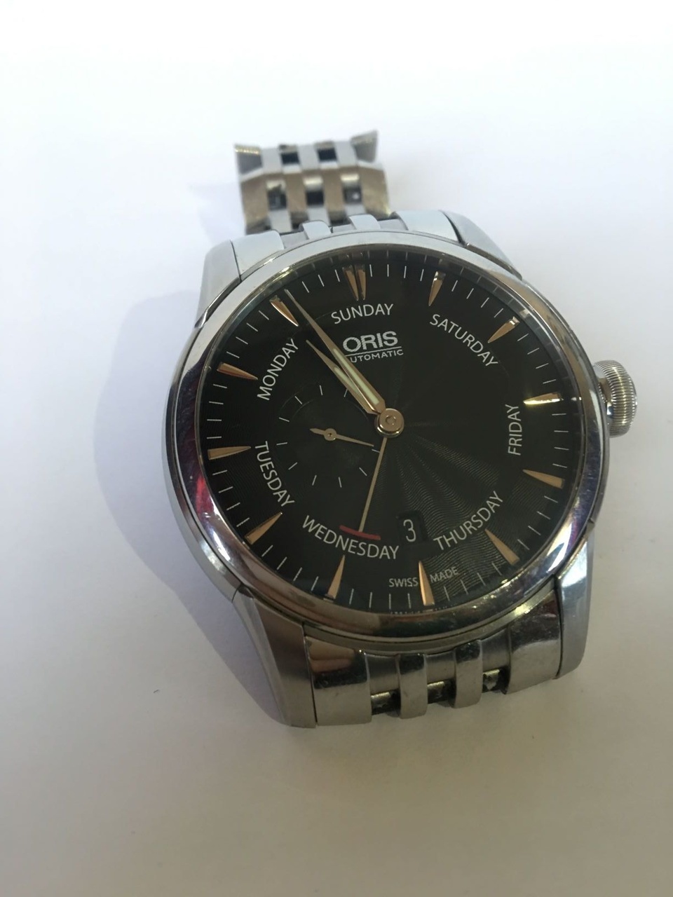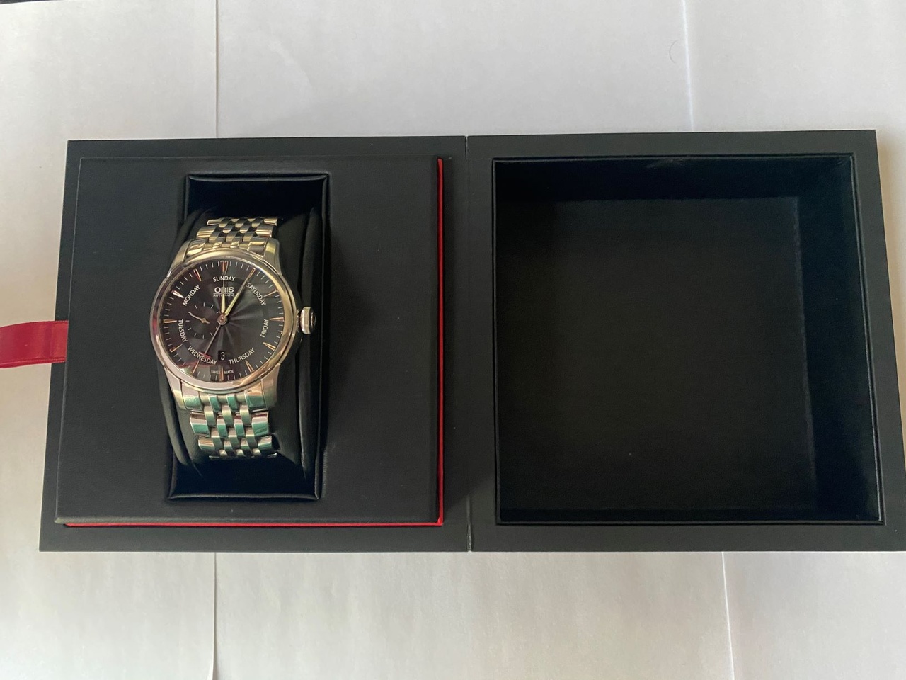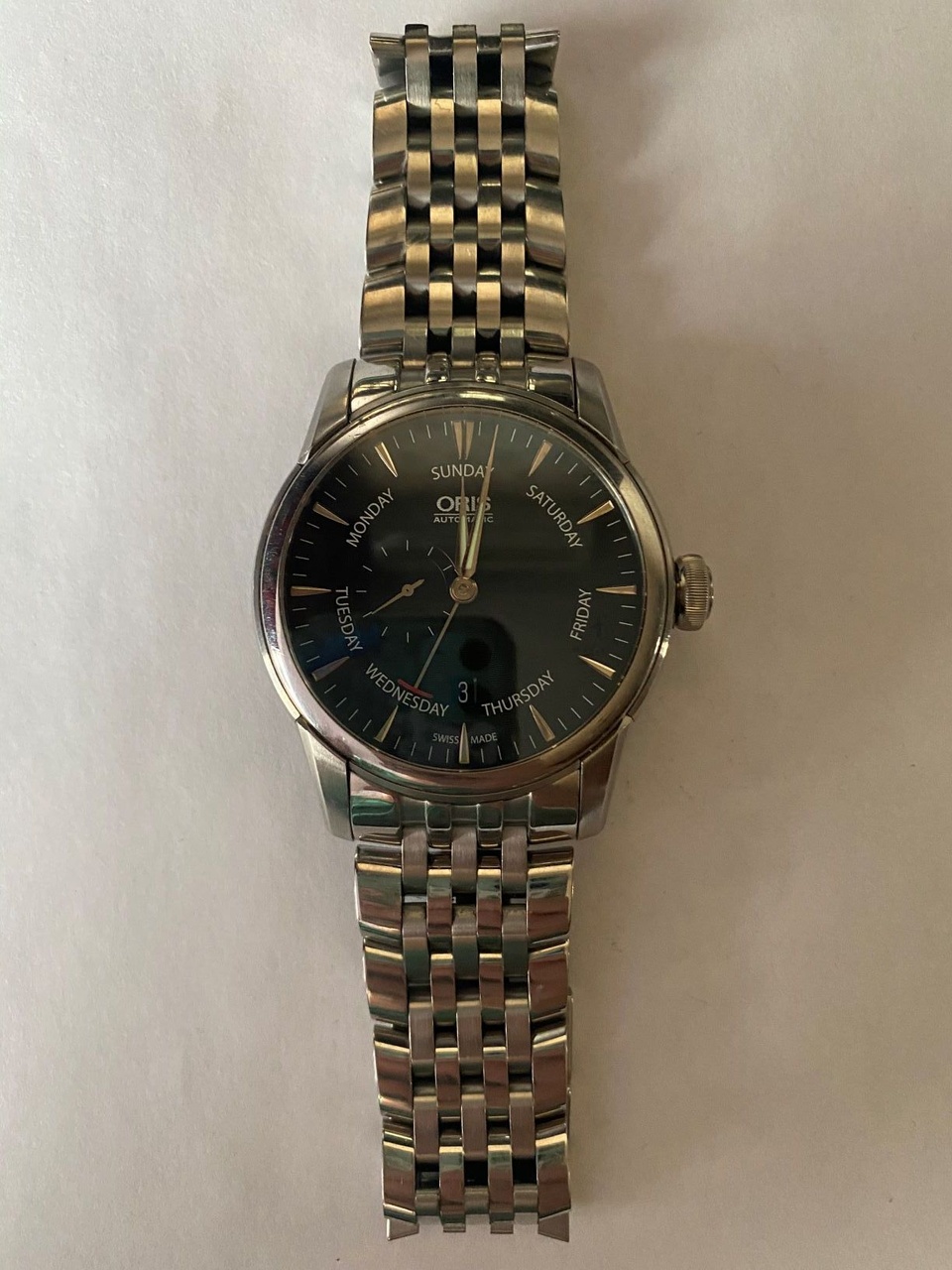 Продаю в Москве Oris Artelier Small Second Pointer Day ref. 01 745 7666 4054-07 8 23 77. Солидные, крупные (диаметр 44 мм), с нестандартным, практичным и привлекающим внимание одновременно, усложнением - стрелочным указателем дня недели. Накладные часовые метки и роскошный гильош циферблата с яркой игрой света. Оригинальный механизм (у Oris есть и механизмы полностью собственной разработки) Oris 745 на базе Sellita SW200-1. Все звенья браслета в наличии. Обмен не интересен, т.к. перешел на дистант и выявился избыток представительных часов для офиса. Без доставки в другие регионы. Рекомендуемая розничная цена - на официальном сайте https://www.oris.ch/ru/watch/artelie...054-07-8-23-77