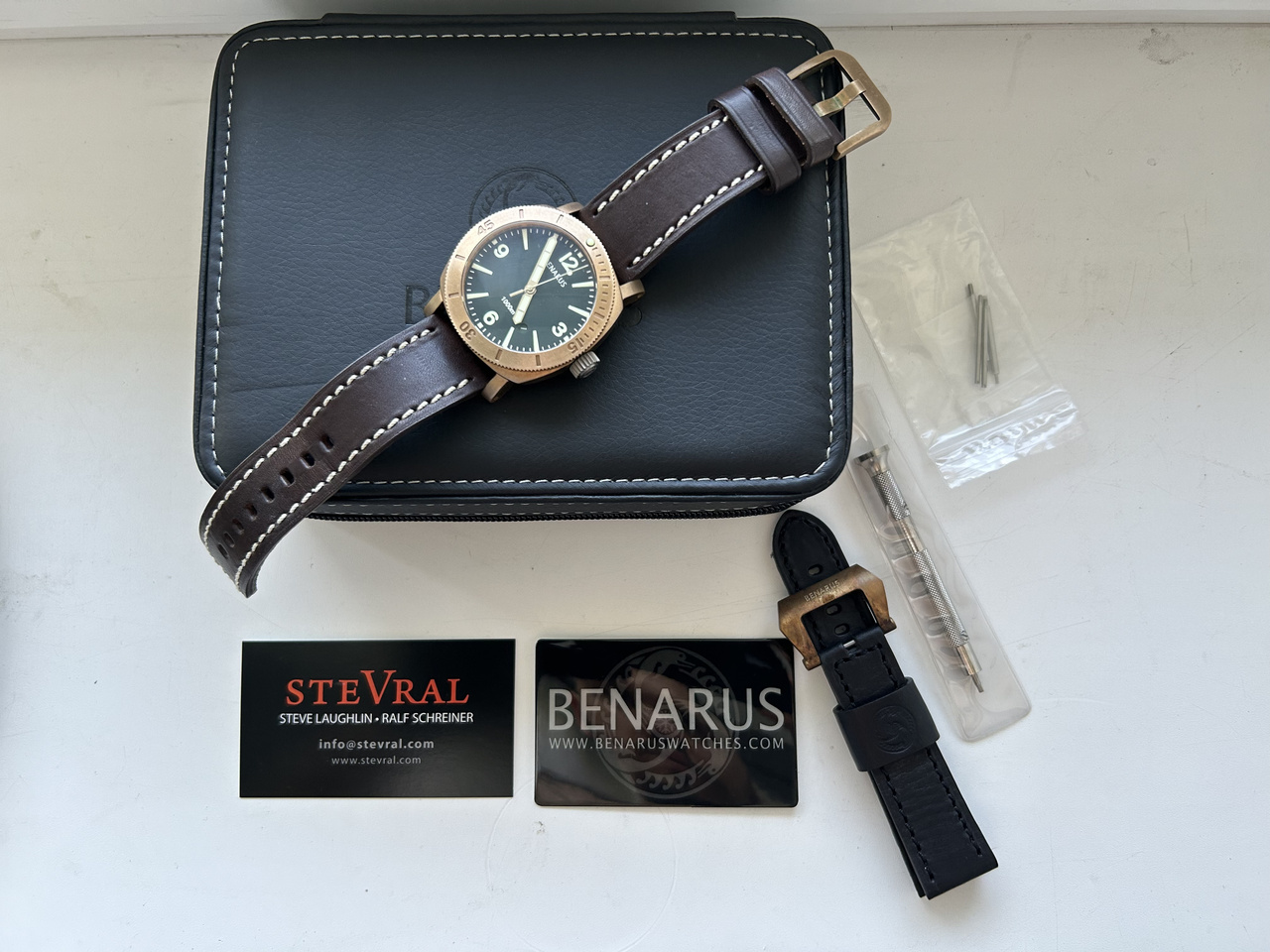 В продаже шикарный и ОЧЕНЬ редкий бронзовый дайвер от легендарного Benarus. Подушка с черным цифером в Пам-стиле из настоящей Cusn8 бронзы, покрывающейся красивой патиной. Корпус 44 мм, не путайте с более простыми моделями с размером 42 мм. В РФ в продаже единственные. В мире встречных предложений не нашел. Часы в отличном состоянии. ЕТА-2824-2, ход точный. Шикарный люм. Титановые заводная головка и задняя крышка. Водозащита 1000 метров. На руке сидят идеально! Кто в теме - тот знает, что это настоящая качественная ОЛДСКУЛ бронза. Установленный кожаный ремешок очень качественный, имеет небольшие следы носки. В комплекте идет новый дорогой оригинальный кожаный ремешок с бронзовой баклей (бакля без язычка, можно переставить с установленного на часах ремня). Полнейший комплект.