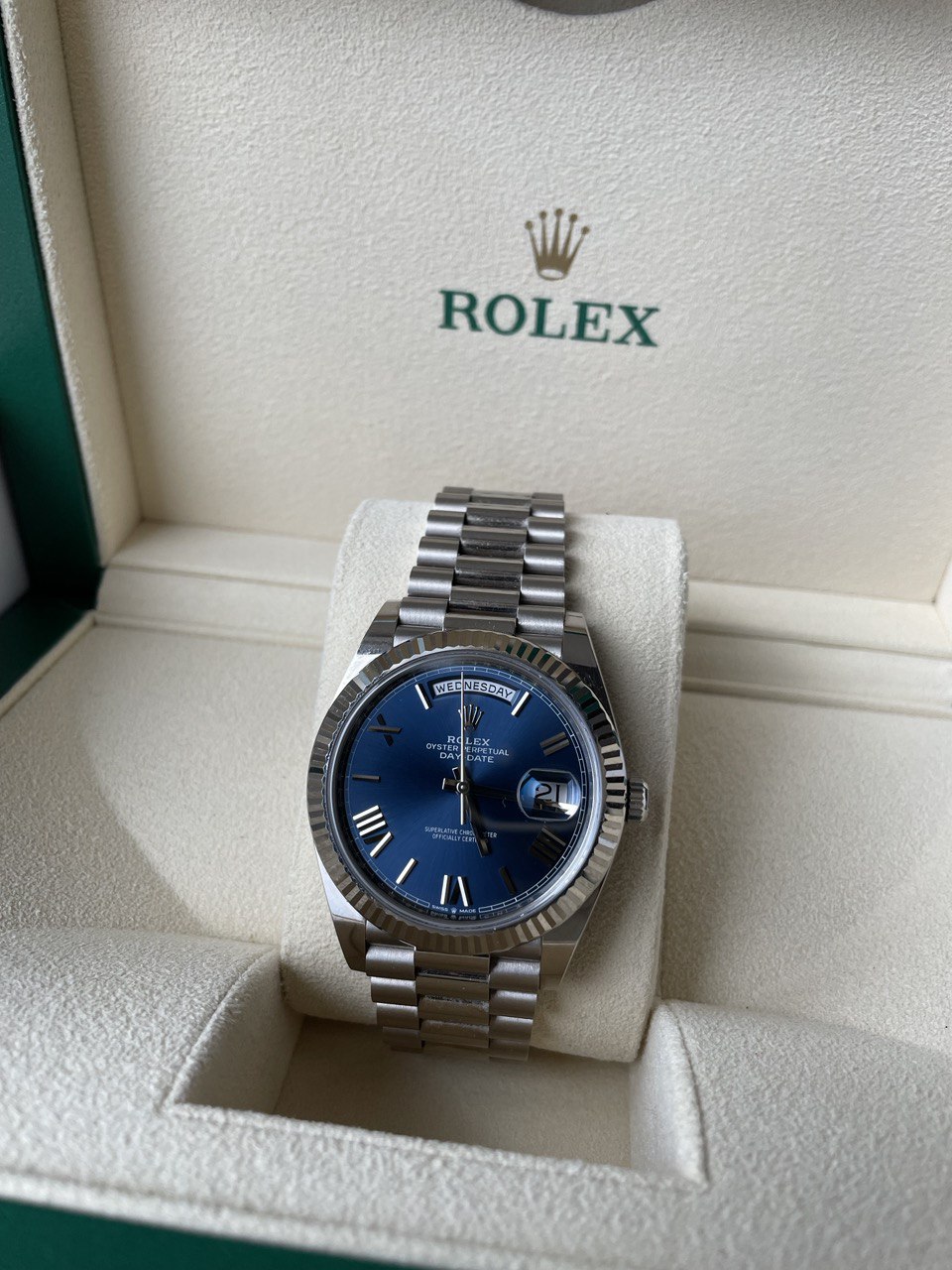 Rolex Day-date 40 мм белое золото c синим циферблатом и римскими цифрами.