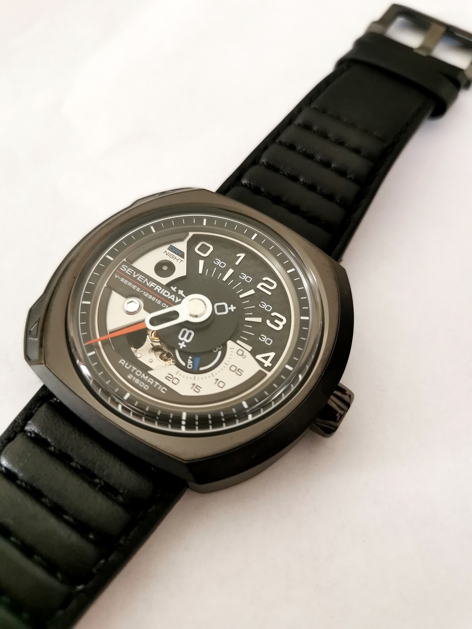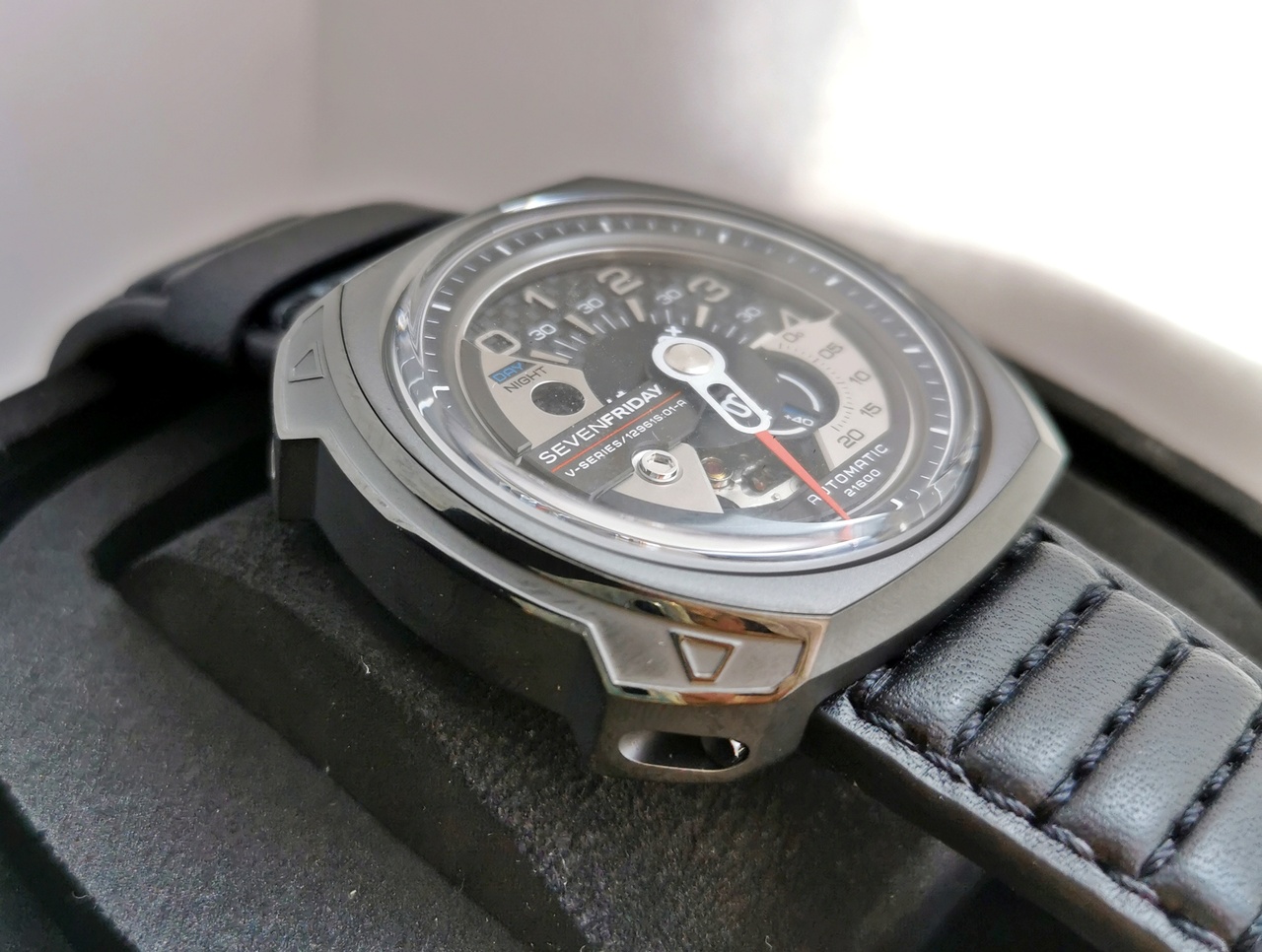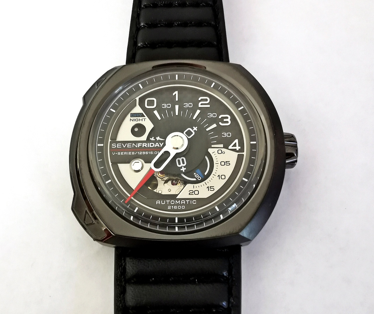 Hовые мужские часы от SEVENFRIDAY. Самая дерзкая модель в коллекции V-series. Часы получили черный матовый корпус, их циферблат отделан карбоном, ремешок простеган как сиденье гоночного автомобиля или спортивного байка.