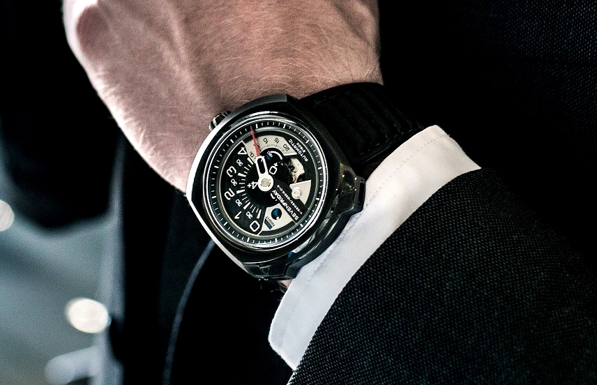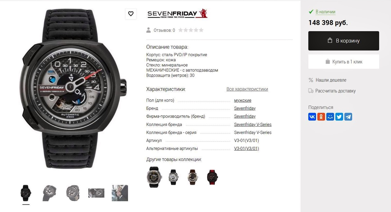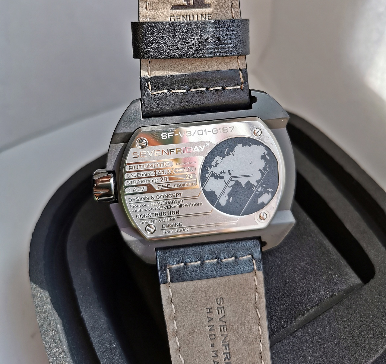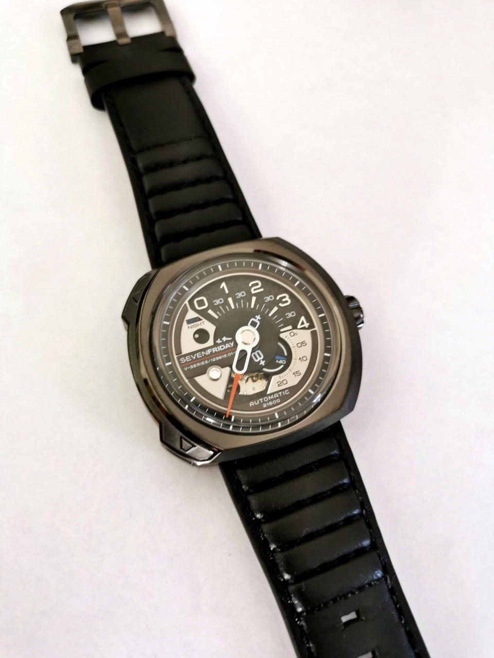Hовые мужские часы от SEVENFRIDAY. Самая дерзкая модель в коллекции V-series. Часы получили черный матовый корпус, их циферблат отделан карбоном, ремешок простеган как сиденье гоночного автомобиля или спортивного байка.