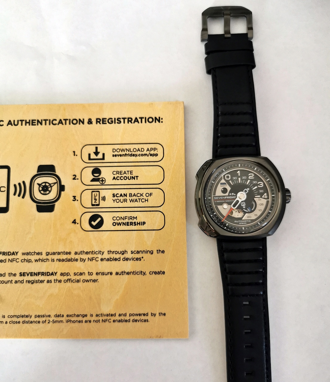 Исключительный дизайн этих часов с уникальной системой определения времени станет вашим ориентиром в создании стильного образа. Четырехуровневый циферблат. Сквозь прозрачное окошко на циферблате можно наблюдать за работой механизма часов, который имеет запас хода до 40 часов. Время отображается при помощи дисков-сумматоров. Вращающийся центральный диск со значениями +0, +4, +8 выполняет функцию стрелки-метки. Чтобы узнать, который сейчас час, нужно прибавить значение диска к цифре (от 0 до 4) на основной шкале, вдоль которой оно перемещается. Аналогично работает секундный индикатор, находящийся в положении 4-х часов. Минуты отображаются центральной стрелкой стандартно. Индикатор день/ночь. Часы оснащены NFC-чипом, в приложении бьются всё Ок. Габаритные размеры: 47,3х49,7мм, толщина 11,3мм.