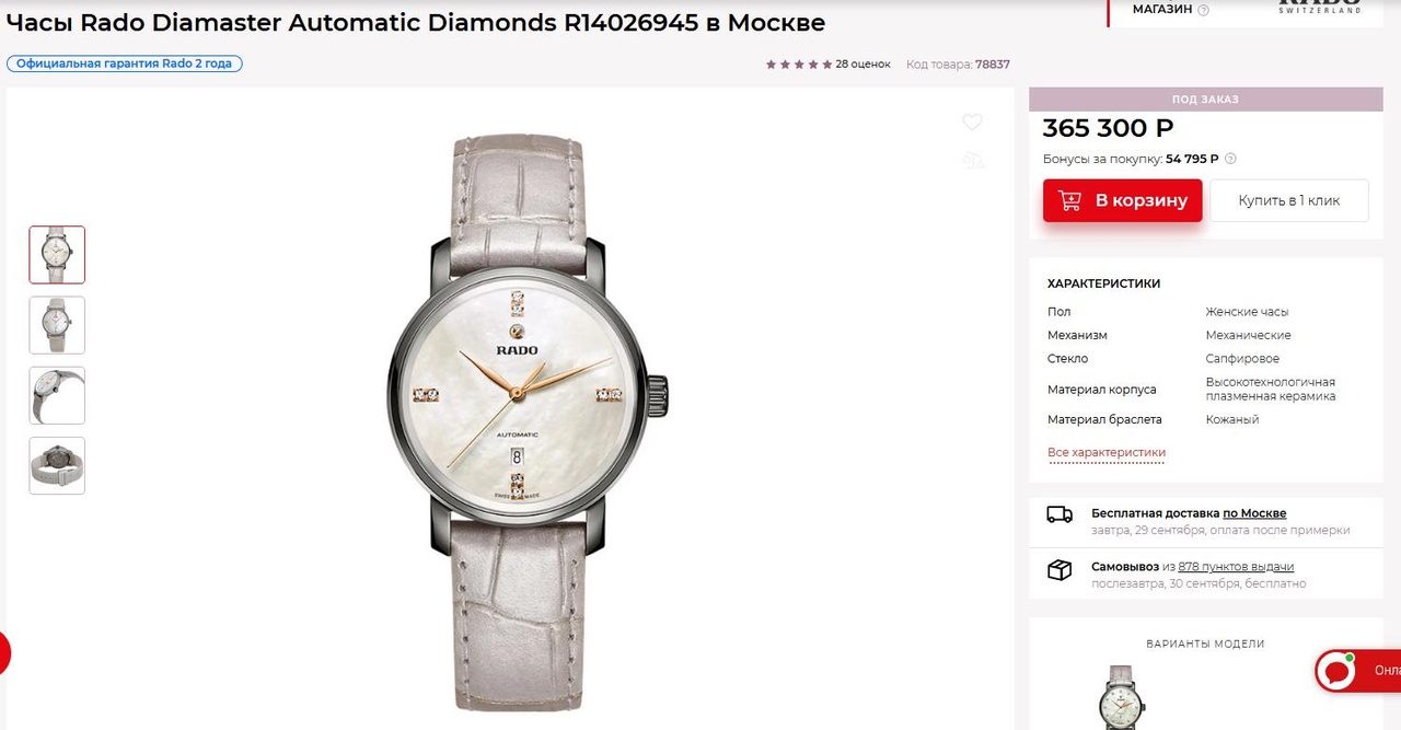 В продаже красивые женские часы Rado Diamaster Automatic Diamonds в размере корпуса 33,6мм изготовленные из высокотехнологичной плазменной керамики, перламутровый циферблат которых украшают 8 бриллиантов.