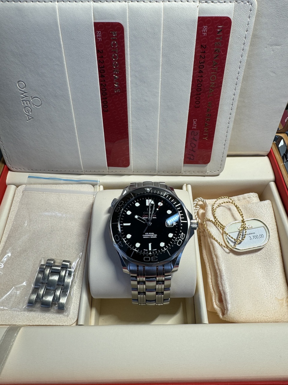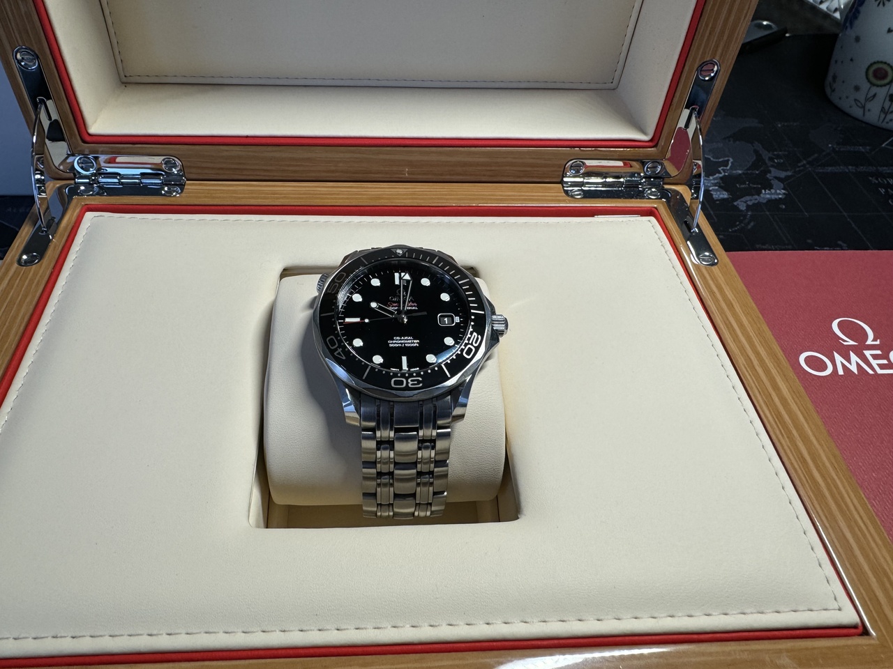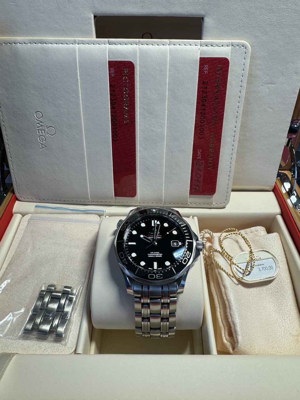 Omega Seamaster 300M 41 мм., черные на браслете, ref. 21230412001003. Часы куплены в 2017 году новыми здесь на форуме, в гарантийной карточке указано 21.01.2017. Следы ношения присутствуют, есть потертость антиблика в районе 8-ми часов (на одном фото смог поймать). Не полировались, не вскрывались. Постарался сделать максимально информативные фото под направленным источником света (у окна фотографии без направленного света). Часы в Волгограде. Полный комплект, звенья, карты, коробка и т.д.