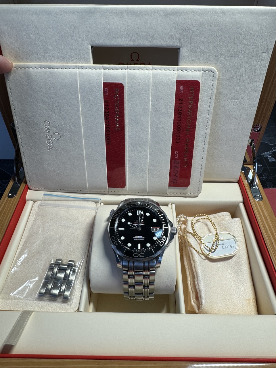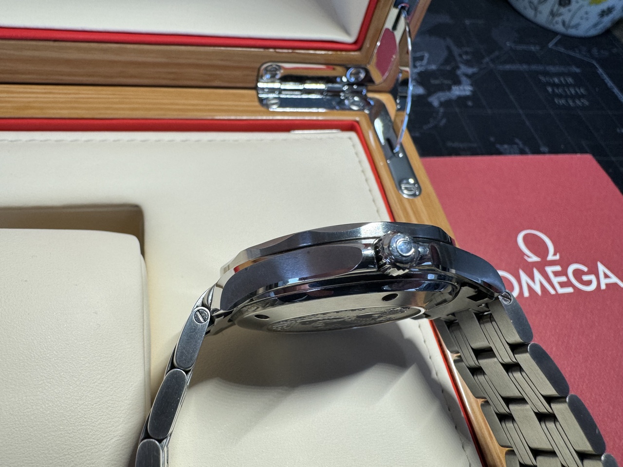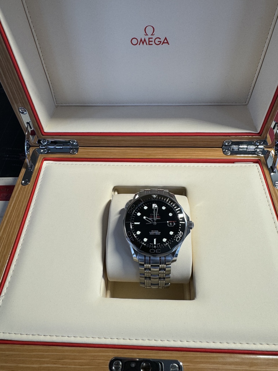 Omega Seamaster 300M 41 мм., черные на браслете, ref. 21230412001003. Часы куплены в 2017 году новыми здесь на форуме, в гарантийной карточке указано 21.01.2017. Следы ношения присутствуют, есть потертость антиблика в районе 8-ми часов (на одном фото смог поймать). Не полировались, не вскрывались. Постарался сделать максимально информативные фото под направленным источником света (у окна фотографии без направленного света). Часы в Волгограде. Полный комплект, звенья, карты, коробка и т.д.