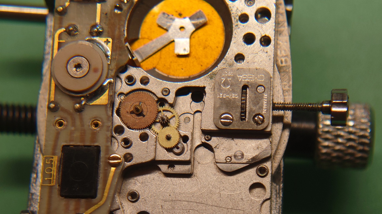 Купил за какие-то копейки, но с заявленной неисправностью "спешит на 12 часов в сутки". Но я ж у мамки инженер, да ещё и профессионально ремонтирую всякую микромеханику, справлюсь на раз-два - подумал я. А вот шиш тебе - подумала омэга. Но конечный результат оказался ближе к моему представлению о том, что должно получиться (ещё бы, 9 месяцев с ними сношался) После репассажа, безуспешного поиска донорского механизма, удалось найти машинку со схожим принципом работы - bulova Accutron, взять приводной и стопорный пальцы индексного механизма, имплантировать их в "омеговский" CEH-B21 и заставить его работать, как прописано в заводских мануалах (поиск которых - отдельная история продолжительностью в полтора месяца).