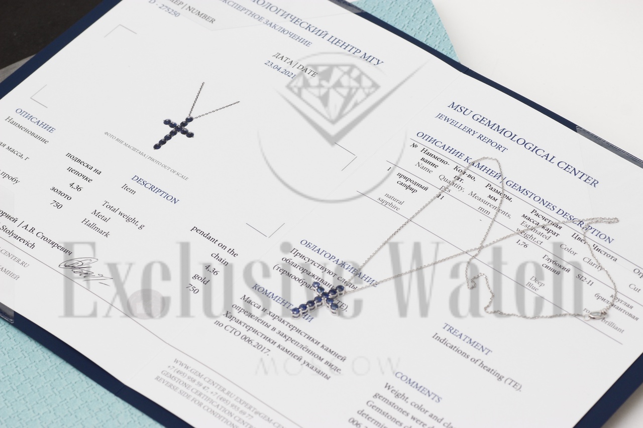 САПФИРОВЫЙ КРЕСТИК В БЕЛОМ ЗОЛОТЕ 750 ПР ПРИРОДНЫЙ САПФИРЫ (МГУ) Расчетная масса: 1,76 карат