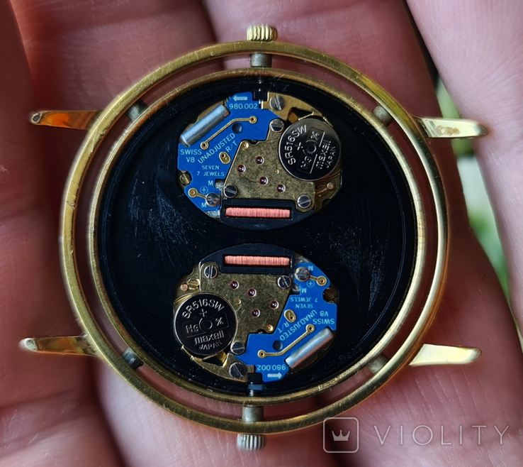 Зениты конца XX века с чужими механизмами не ценятся и особенно не ценятся с чужими кварцевыми механизмами. В этих часах (ref. 27.0040.981) стоят два чужих кварцевых механизма ETA-ESA 980-002.