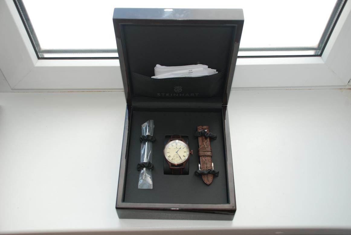 Написал письмо Гюнтеру на заказ в 44-х миллиметровом корпусе в блестящей стали. А в конце письма приписал, а не осталось ли у вас, мил человек, коффейных корпусов в размере 47. Гюнтер ответил в течение часа. Сказал, что есть еще один корпус, может собрать, если надо. Естественно надо! Плюс к этому заказал еще один ремень (видно на фото), которой с барского плеча был презентован мне (думаю поставить на Авиатор Волмаксовский) и заказал все это в деревянной коробке. Отправил заказ. И тишина.... Несколько раз напоминал о себе. Пришел счет на 395 евро. Оплатил PayPal. Гюнтер подтвердил получение денег и сказал, что отправит в течение 7-и дней, т.к. надо собрать часы.