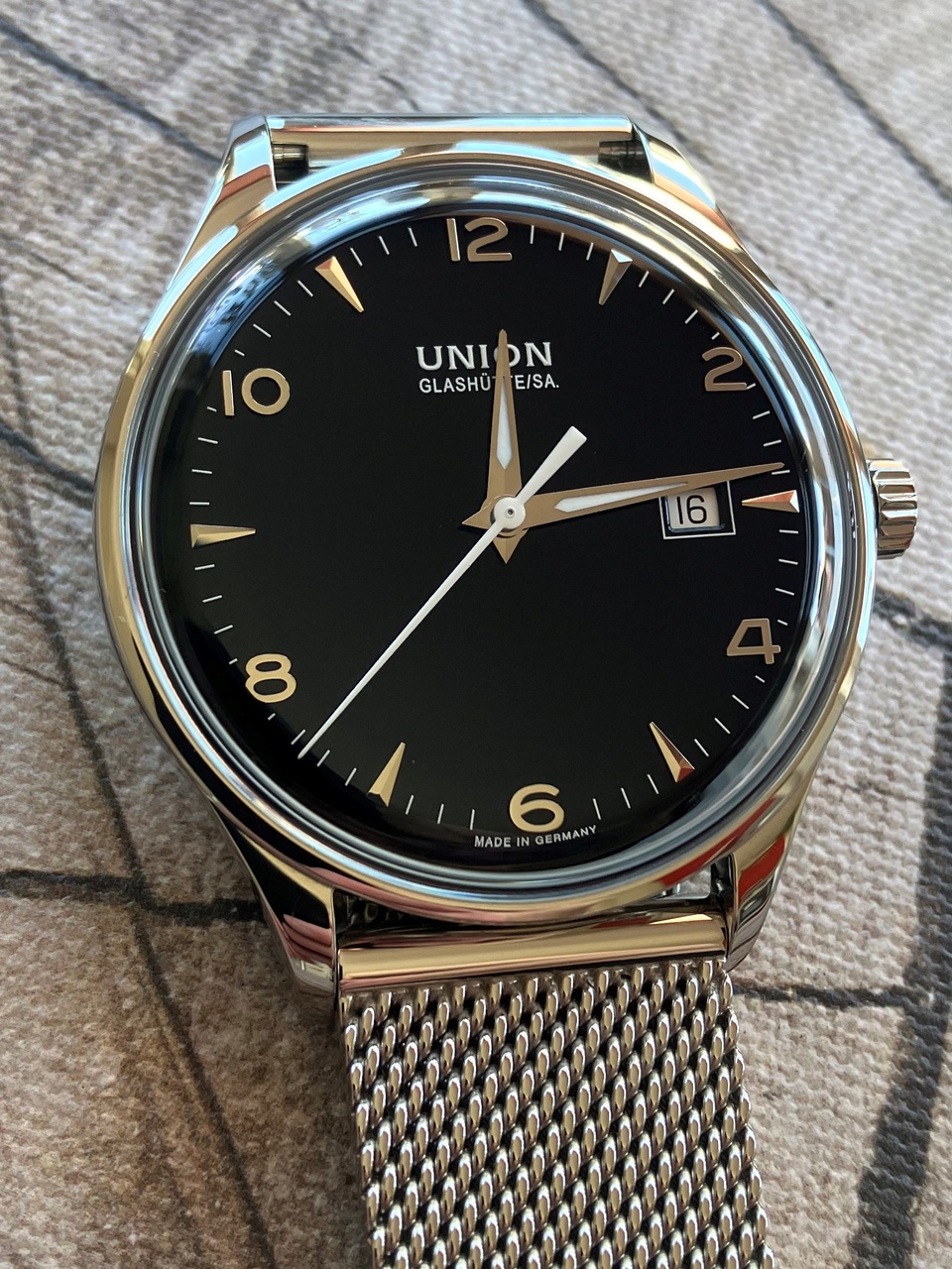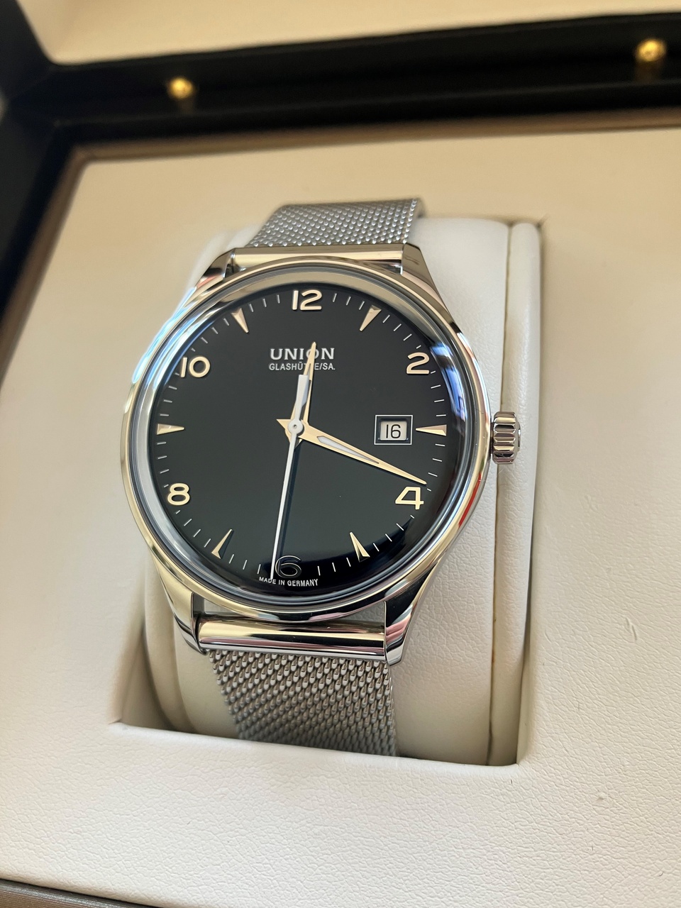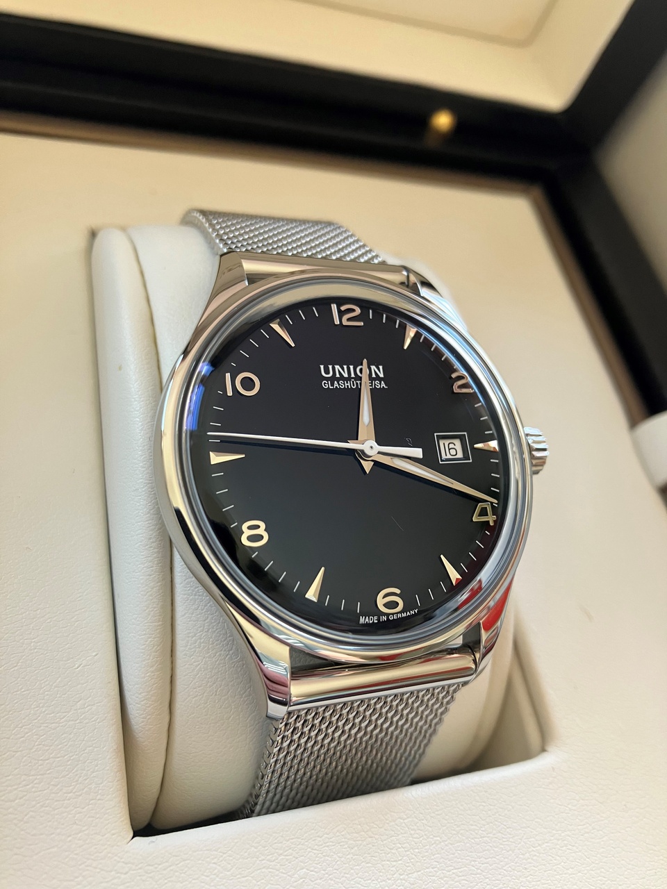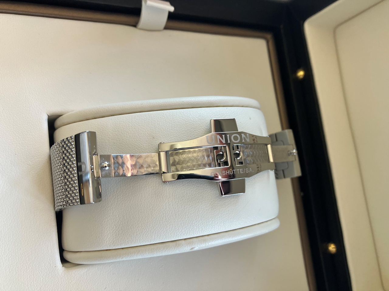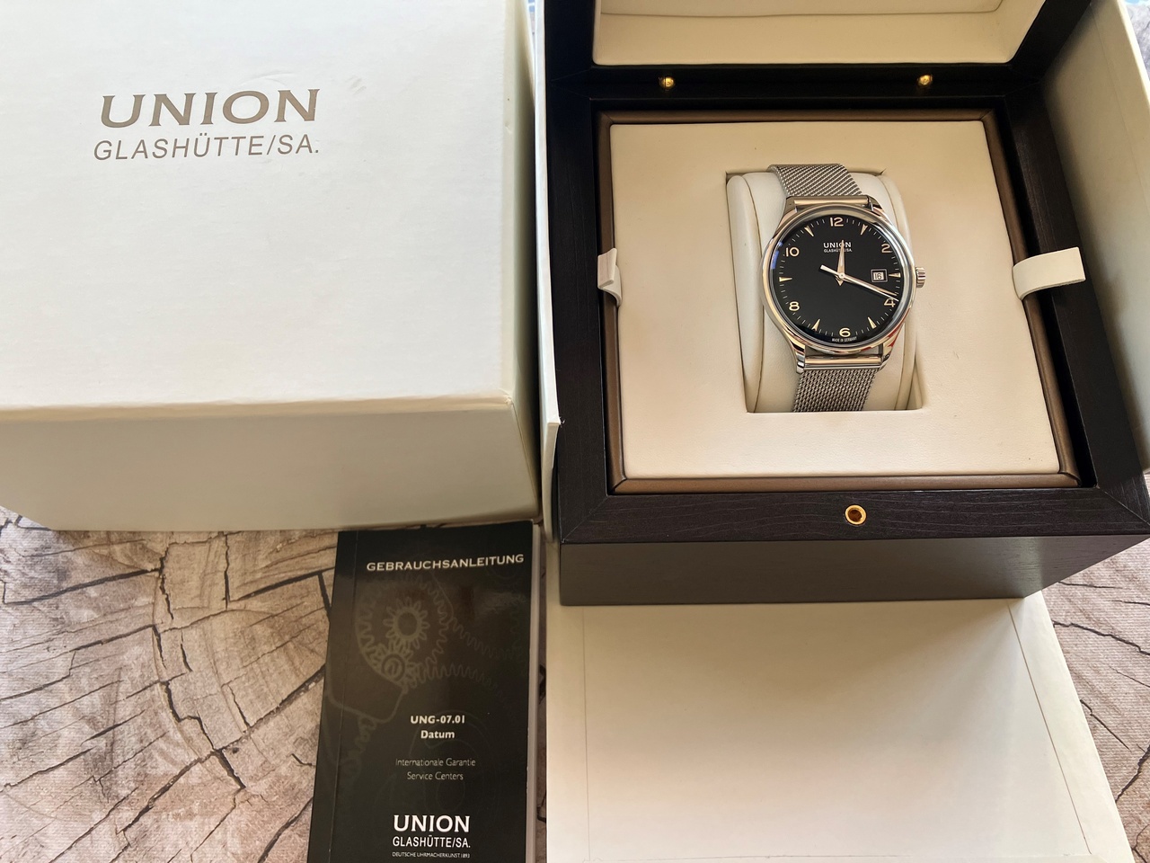 В продаже шикарные неподвластные времени, немецкие мужские часы Union Glashütte из коллекции Noramis (Ref. D012.407.11.057.00) в прекрасном состоянии, одевали пару раз. Местами сохранились пленки. В комплекте: часы, внешняя коробка, деревянная шкатулка, макулатура, доп. звенья.