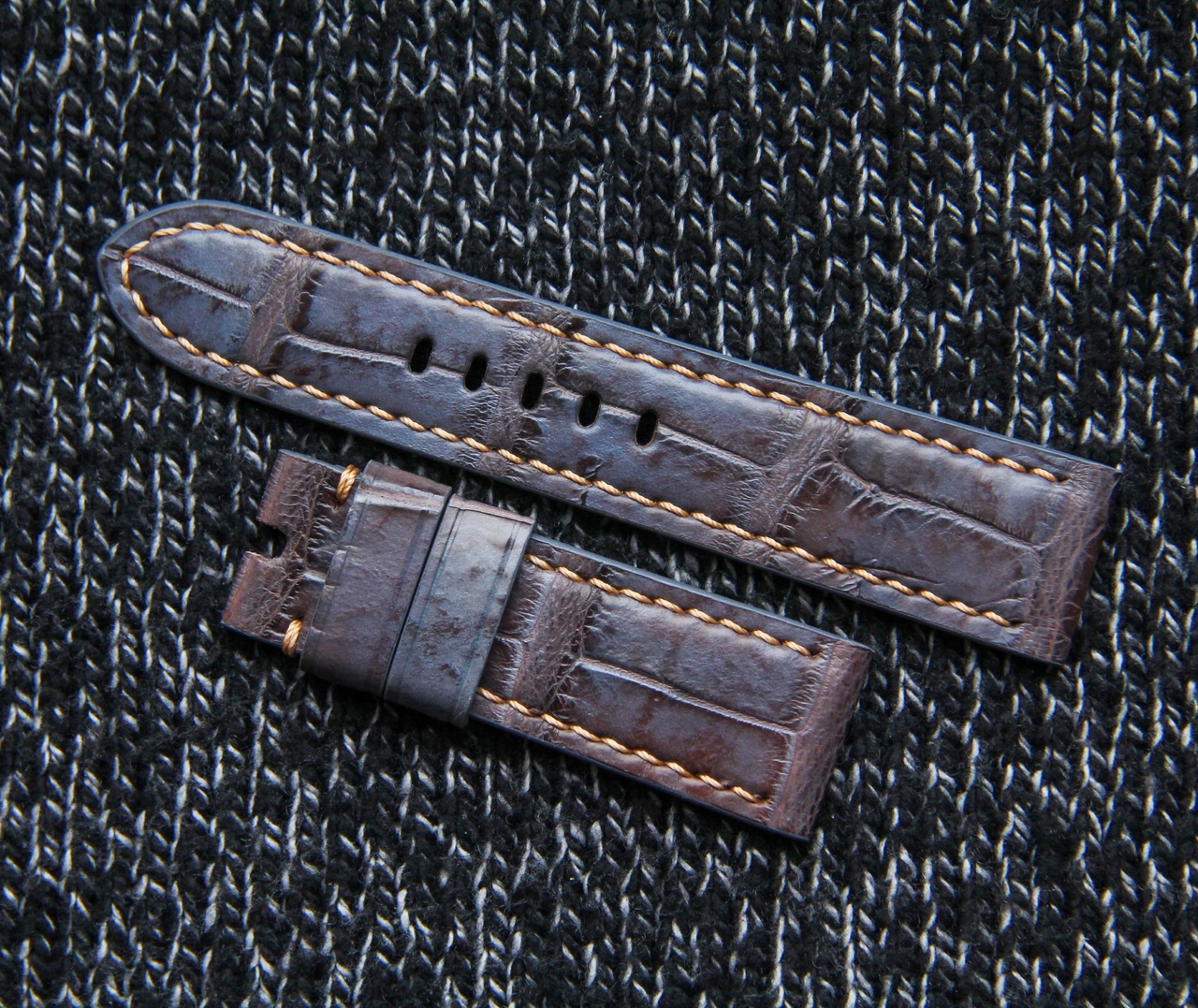 Сиреневый крок с классическим финишем. Ремень имеет интересный окрас, как бы с напылением сиреневого на коричневую базу. Вживую очень необычный и красивый цвет. Рисунок кожи классический, бежевая толстая косая строчка. Ширина 24/22 мм, длина 125/75 мм, толщина около 3,5 мм, с возвышением по центру ремня, средне мягкий. Подклад - черная коза (Falco Pellami), края окрашены полиуретановой матовой краской в цвет. Выделка лица и подклада - Италия. Две шлевки, подвижная и вшитая.
