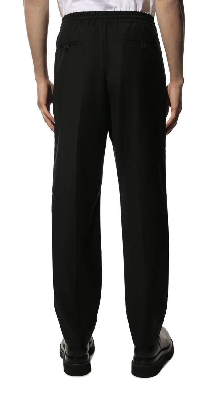 В повседневных брюках из осенне-зимней коллекции марки, основанной Ивом Сен-Лораном, сочетаются черты классического и спортивного стилей. От первого здесь — черный цвет, стрелки и плотная шерсть. А от второго — широкий эластичный пояс-кулиска, с помощью которого можно регулировать посадку вещи.Универсальная модель,свободного кроя,которая впишется в гардероб каждого стильного мужчины.