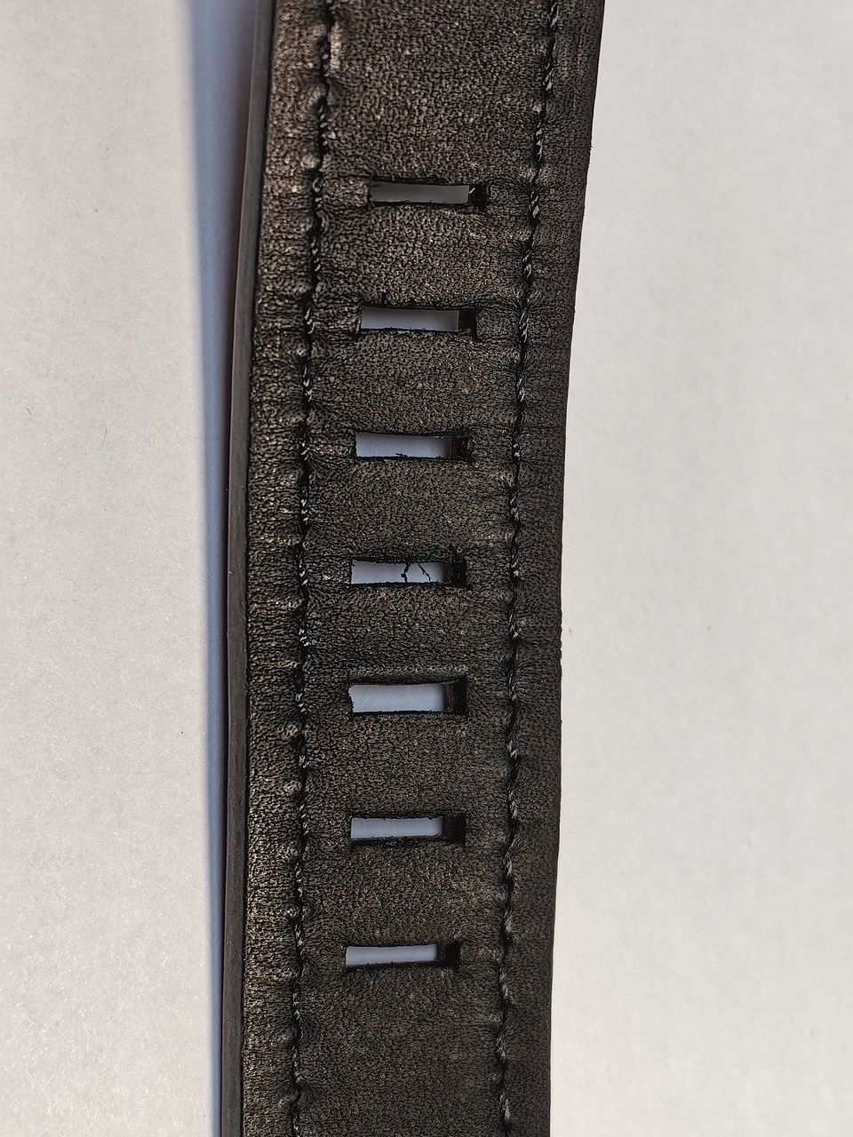 Но при всех плюсах этих часов имеются и минусы. Во первых это заводная головка. Она крупная, традиционная для часов пилотов некоторых моделей, конусообразно выходящая на максимальный диаметр, с множеством острых ребрышек по узкому гурту. Головка ухватистая , но в некоторых положениях кисти, она впивается в руку. За счет приподнятой задней крышки, головка находится в одной плоскости с ней, не опускаясь ниже, что несколько минимизирует неудобства. С некоторой натяжкой отнесу к минусам и ремешок, точнее прямоугольную перфорацию под язычок бакли. Ширина ремешка 22мм, а ширина перфорации 7,5мм, то есть 1/3 от ширины ремешка выбывает из «каркаса жесткости». На достаточно толстом ремешке это мало заметно, но на ремешках тонких и мягких это приводит к дополнительным деформациям кожи (ремешка). И, при замене изношенного ремешка, вероятно, будет непросто подобрать новый под данную баклю, разве что изготовить самостоятельно.