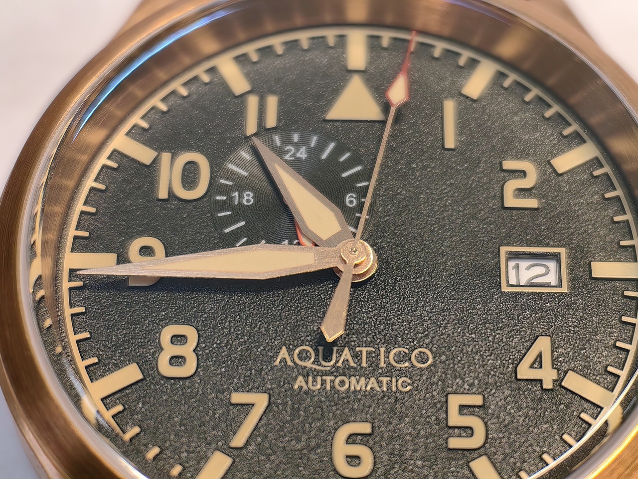 Стекло над циферблатом плоское, сапфировое, с большой округлой фаской, имеет антибликовое покрытие. Циферблат вероятно пластиковый, штампованный цвета (хаки?)умбры натуральной с добавкой окиси хрома. Зеленым его можно назвать с большой натяжкой. Все обозначения на циферблате рельефные, включая брендовую надпись Aquatico. Имеется оформленное прямоугольной рамкой окошко даты на 3х часах. Малый циферблат в верхнем левом углу показывает время в 24х часовом формате. В часах установлен механизм Seiko NH37. Стрелки и часовые индексы имеют покрытие приличного качества люминофорным составом. Заводная головка , похоже изготовленная из бронзы, завинчивается. На верхушке головки имеется рельефный значок напоминающий дельфинчика. Цвет головки и корпуса немного отличается оттенком , головка - желтоватая, корпус - красноватый.