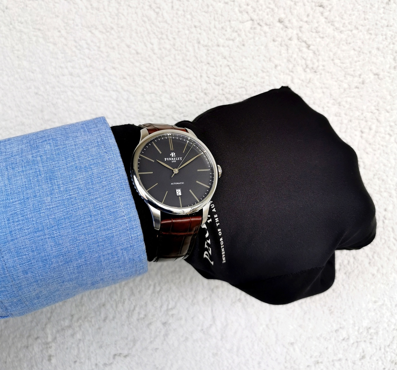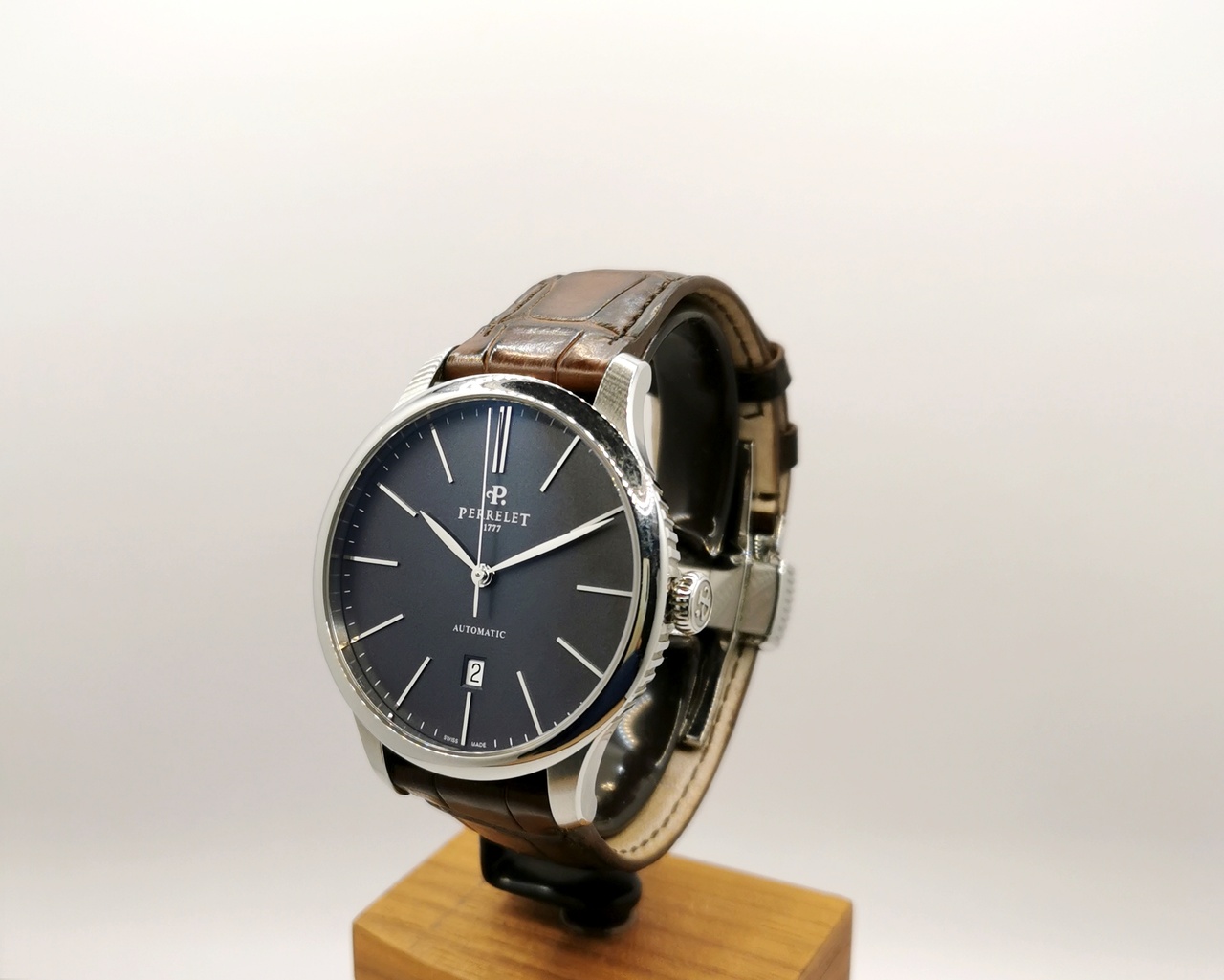 Мужские часы Perrelet First Class заметно отличаются от остальных моделей этого семейства. Отличия заключаются в более классическом и утонченном исполнении. Строгий дизайн подчеркивает их сдержанный и целостный характер. Изысканный аксессуар выполнен в корпусе из нержавеющей стали размером 42,5 мм и толщиной 10,6 мм. Тонкие серебристые стрелочки отлично смотрятся на графитовом фоне циферблата в сочетании с ремешком из кожи аллигатора тёмно-коричневого цвета. Часы с механическим калибром и с автоподзаводом. Вся красота часов надежно скрыта от механических повреждений, влаги, пыли и прочих неблагоприятных условий под сапфировым стеклом и прочной стальной задней крышкой. Изящный образ эксклюзивных часов дополняет раскладывающаяся стальная застежка и кожаный ремешок из аллигатора.