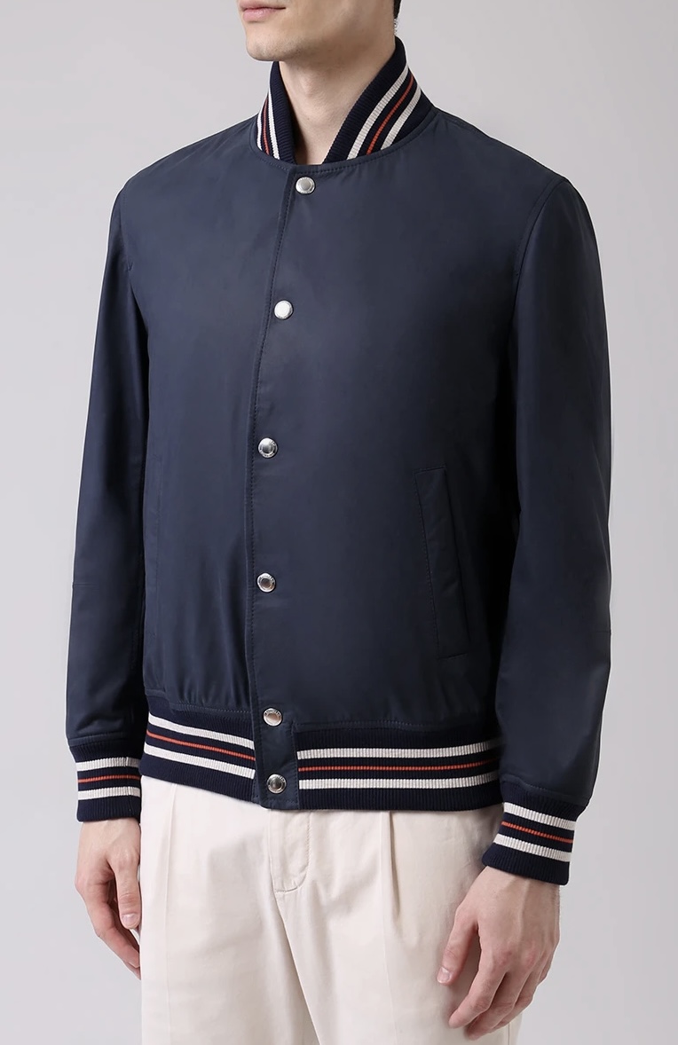 Ценность материалов Brunello Cucinelli облагораживает культовый спортивный стиль куртки-бомбера из кожи,прошедшей специальную обработку,что делает её невероятно мягкой, характеризующейся тонкой и слегка бархатистой поверхностью, которая подчеркивает сезонные оттенки с глубоким и однородным эффектом. Классические контрастные детали из трикотажа в рубчик на воротнике, манжетах и нижнем крае завершают изделие.