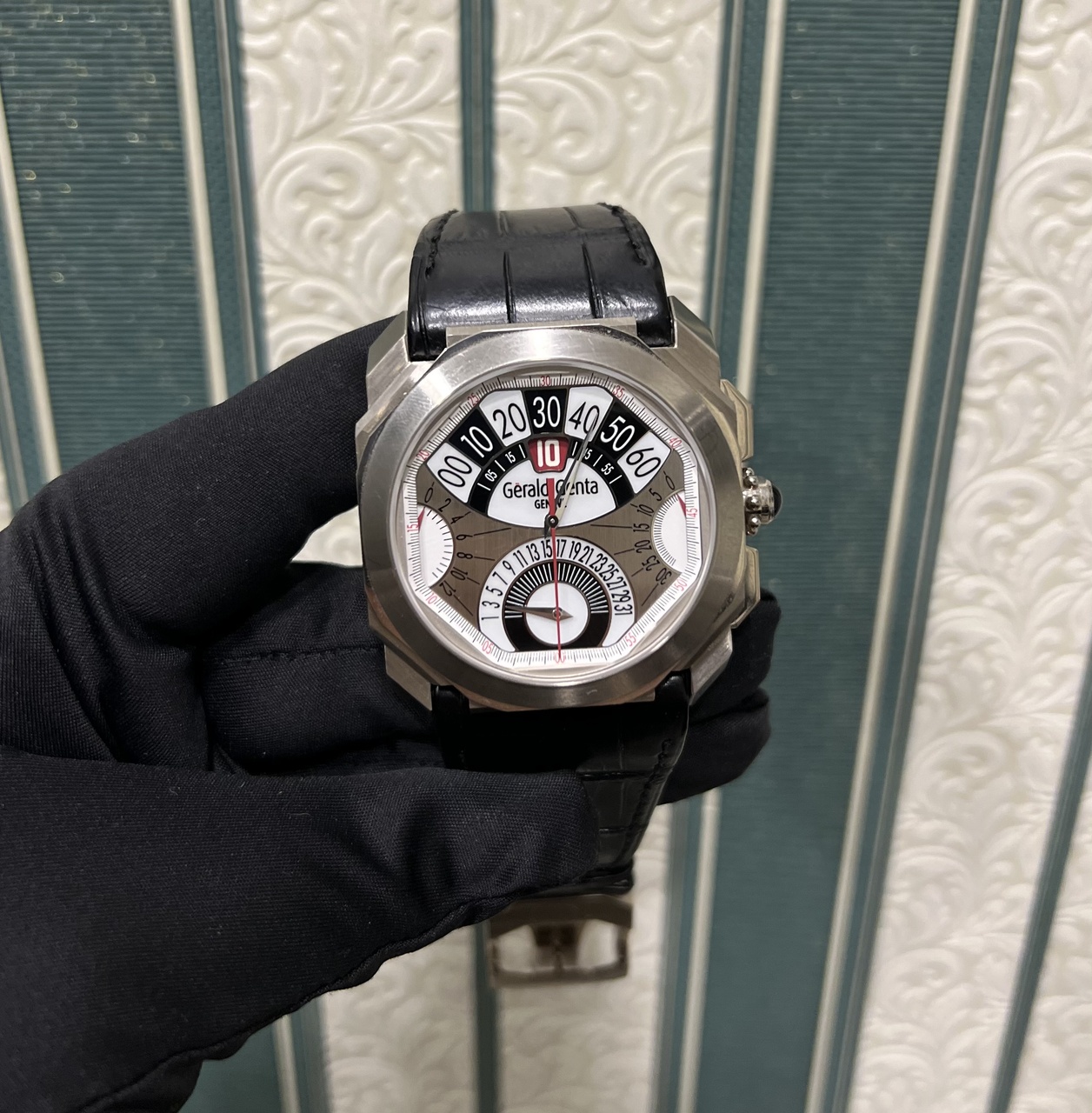 Джеральд Джента нарушает традиции. Точнее, устоявшиеся представления о том, как должны выглядеть часы. Об этом говорит все в этой модели часов. Перевёрнутый хронограф, который делает старт на отметке «6» часов. Индикация «прыгающий час». Ретроградные стрелки минут, счетчика хронографа и даты. В этих часах вы точно будете в центре внимания, корпус диаметром 44,5 мм в белом золоте 750 пробы отлично сидит на запястье. Удобная клипса стоит на ремне из кожи крокодила. Легендарный мастер, легендарные часы. Находка для истинного коллекционера.