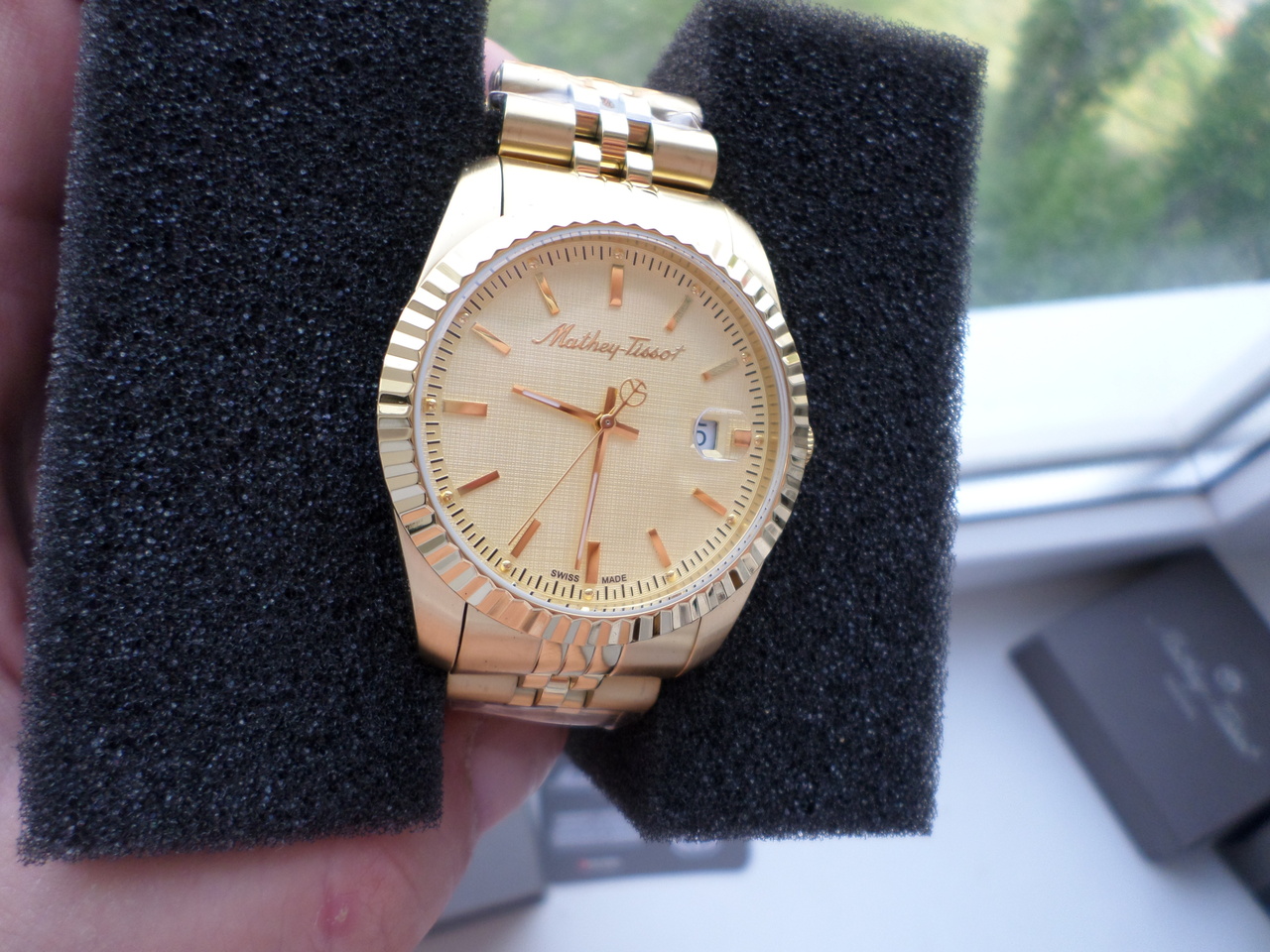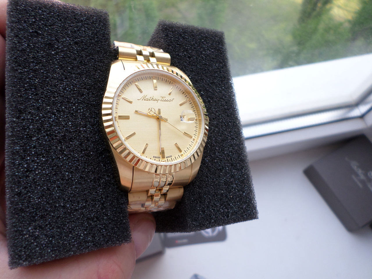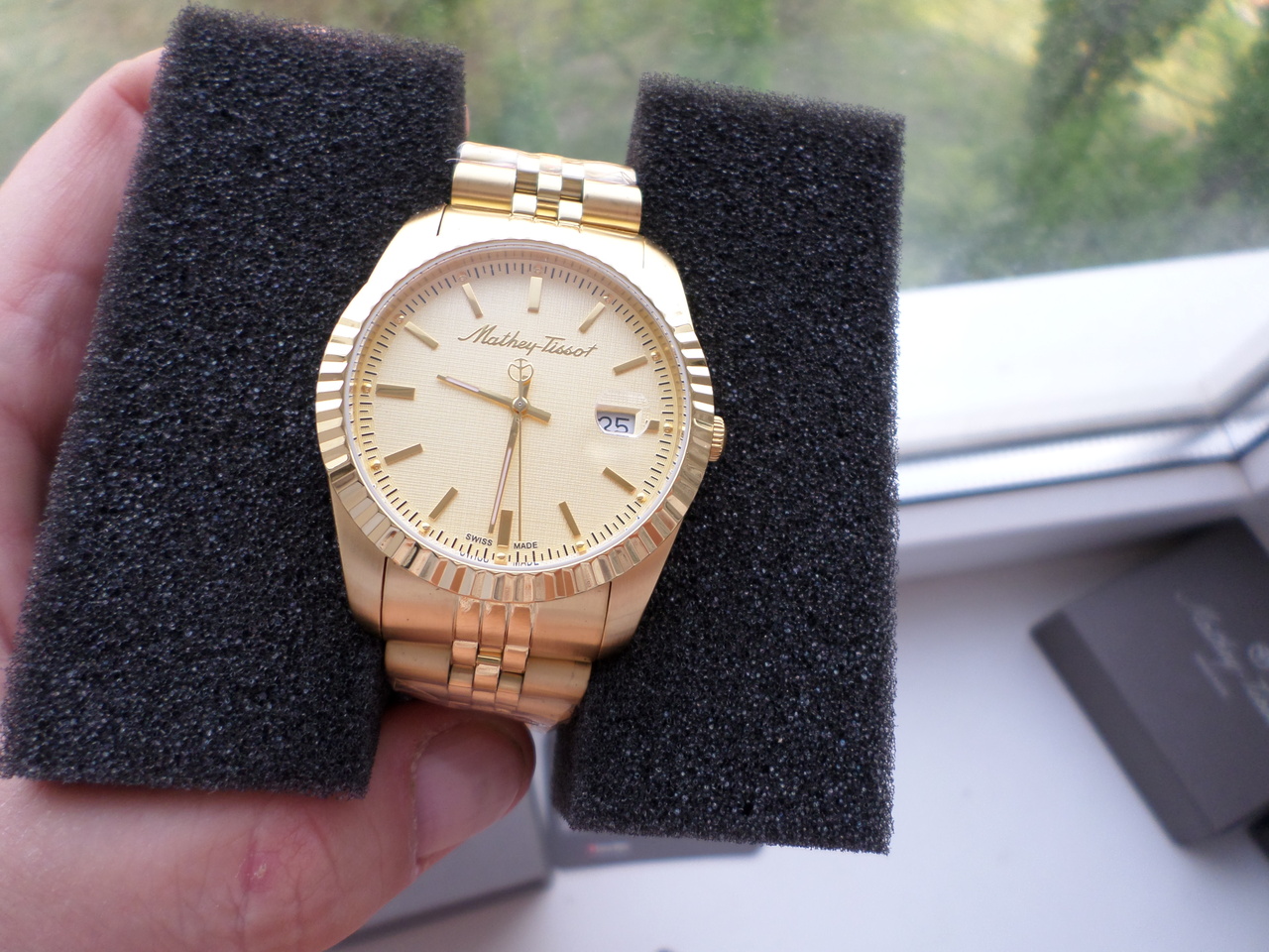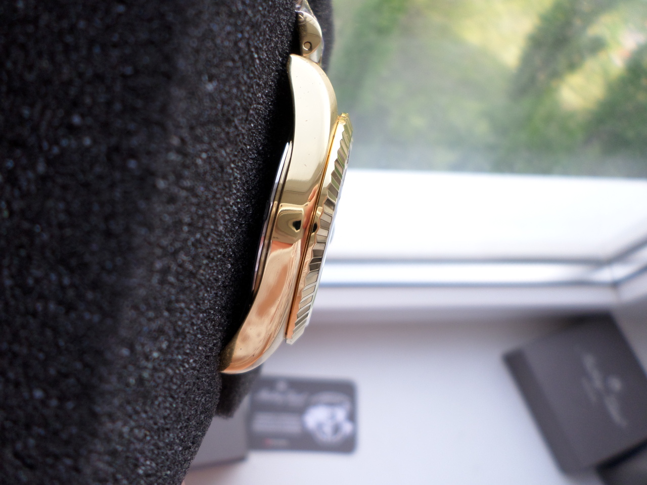 Корпус и браслет из нержавеющей стали с PVD покрытием из желтого золота. Фиксированный безель из желтого золота PVD. Желтый циферблат со светящимися стрелками из желтого золота и часовыми метками. Люминесцентные стрелки и маркеры. Отображение даты в положении "3 часа". Кварцевый механизм Ronda калибра 585. Устойчивое к царапинам минеральное стекло Размер корпуса: 40 мм. Толщина корпуса: 5 мм. Ширина браслета 20 мм. Складная застежка. Водонепроницаемость до 50 метров / 165 футов. Функции: дата, час, минута, секунда. Swiss Made. Видео
