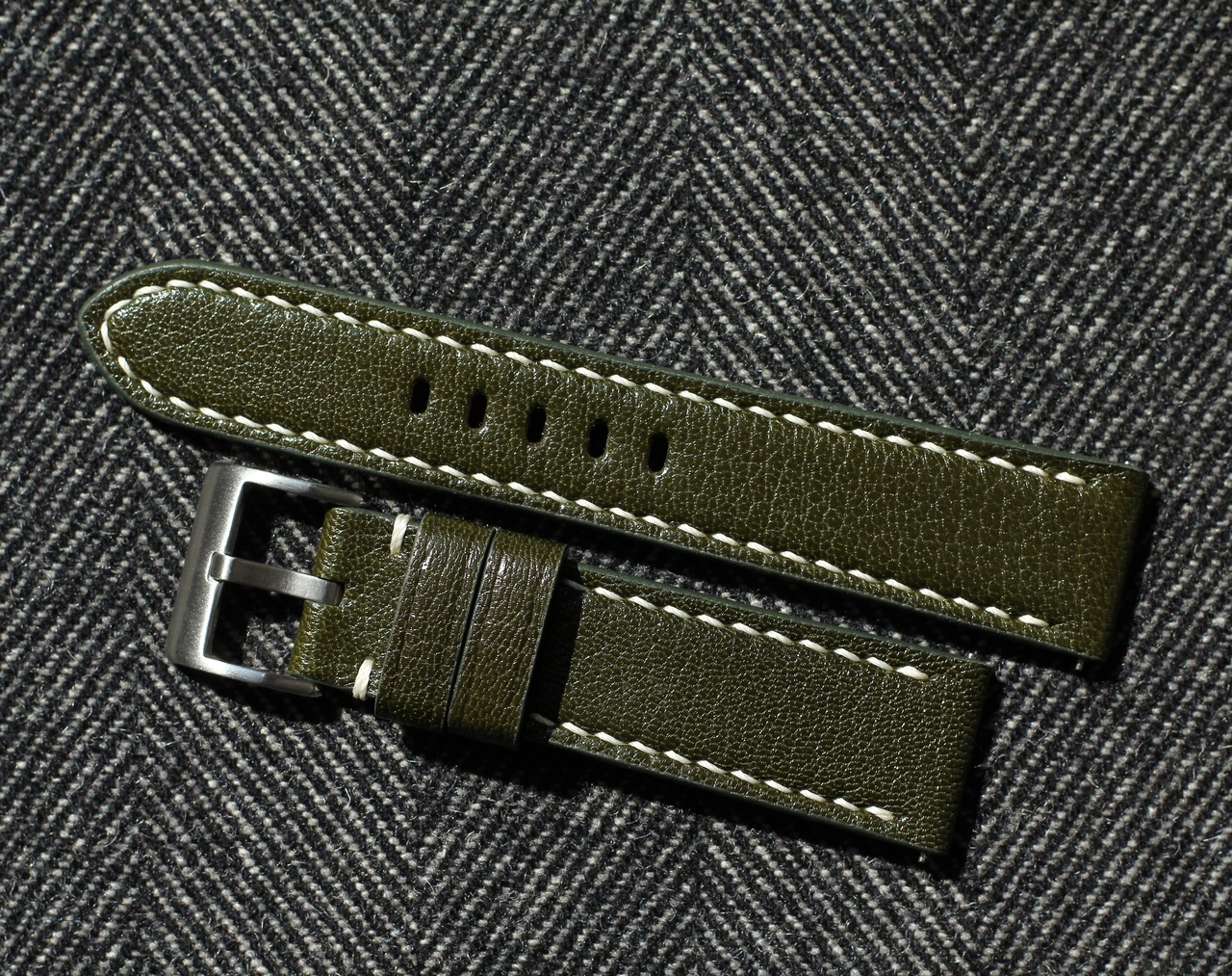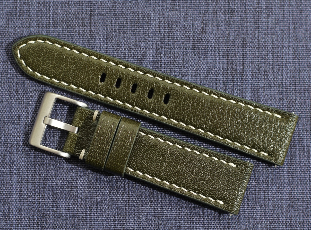 Бутылочная коза от Antiba. Хромовое дубление, потрясающая фактура и выделка. Бежевая косая строчка экрю. Ширина 22/20 мм, длина 125/80 мм, толщина около 3.5 мм, мягкий. Подклад из гипоаллергенной козочки, края окрашены полиуретановой матовой краской в цвет. Выделка лица и подклада - Италия. Две шлевки, подвижная и вшитая.