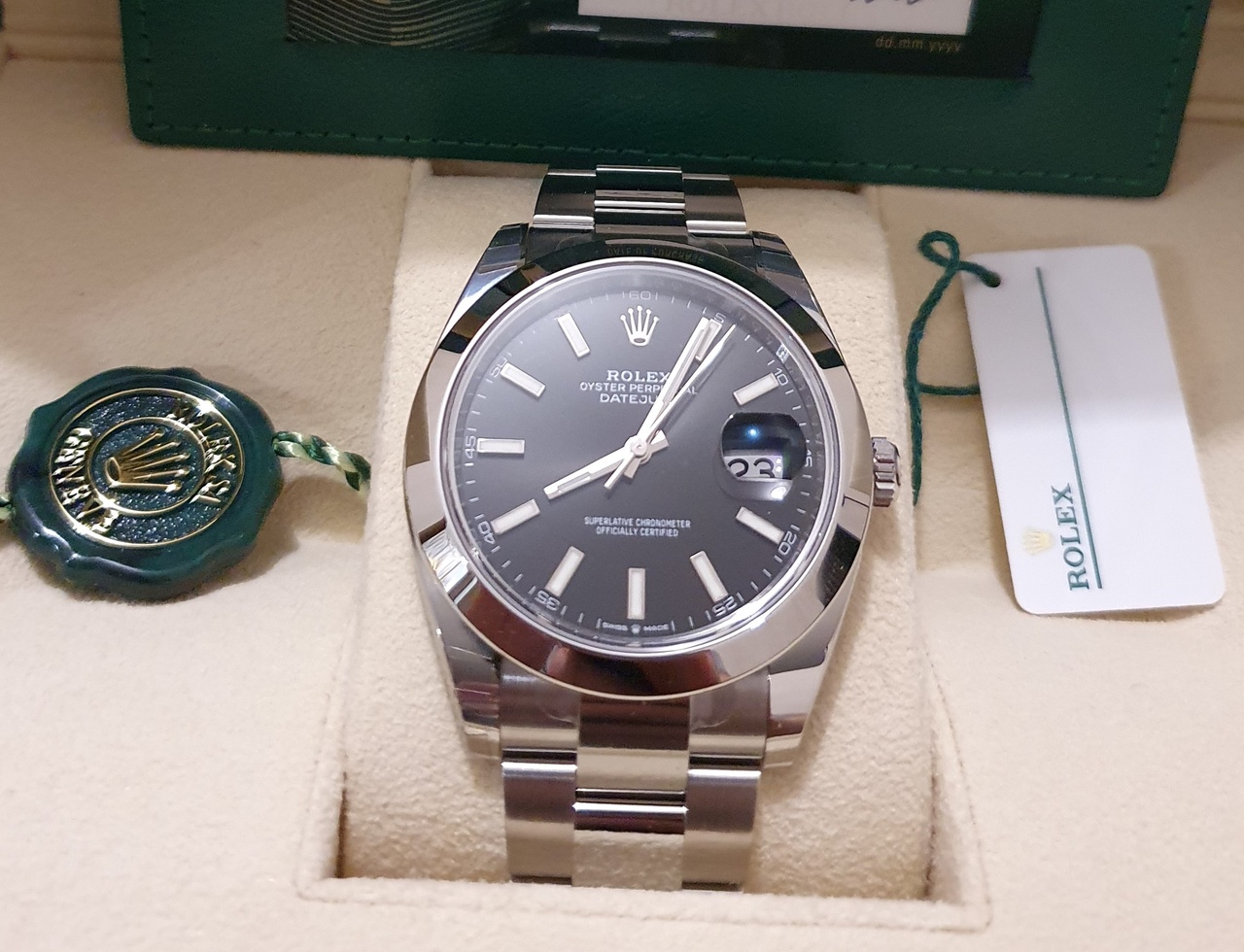 При этом можно долго спорить об уместности Дейтджаста на юбилее и/или с рифленым безелем со спортивной одеждой, но черный Дейтджаст на ойстере с гладким безелем - это действительно уникальный Ролекс с точки зрения универсальности: хоть под смокинг, хоть на Харлей) Часы одинаково и спортивные и классические, и черный циферблат (в отличие от того же синего) позволяет вообще не задумываться о цветах одежды, ибо черный подходит ко всему.