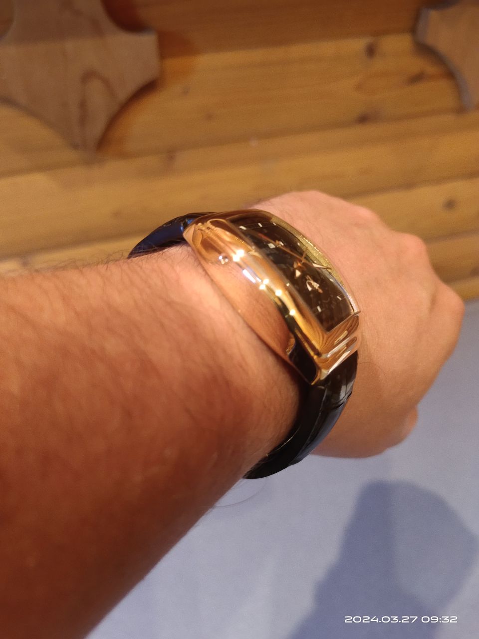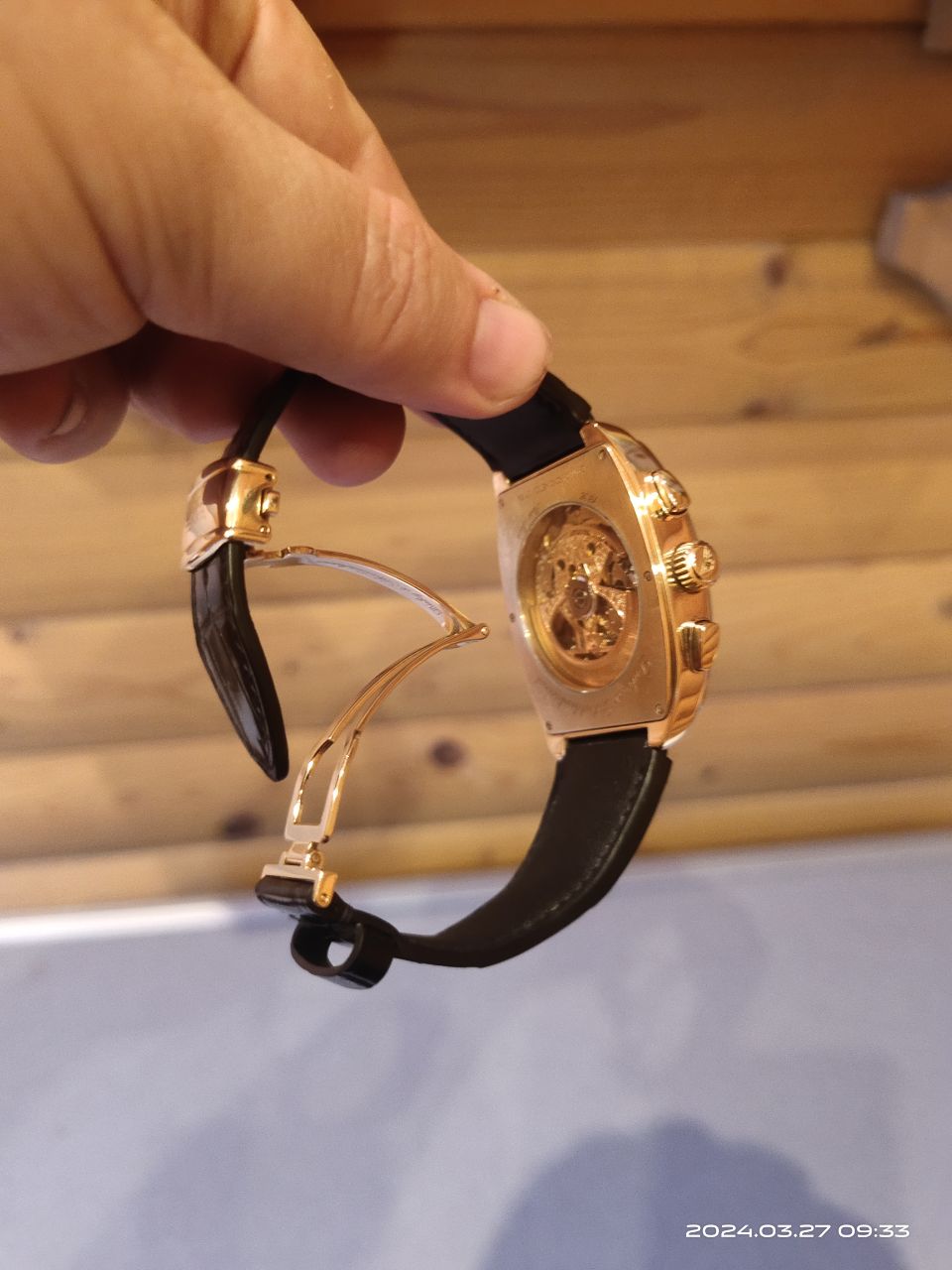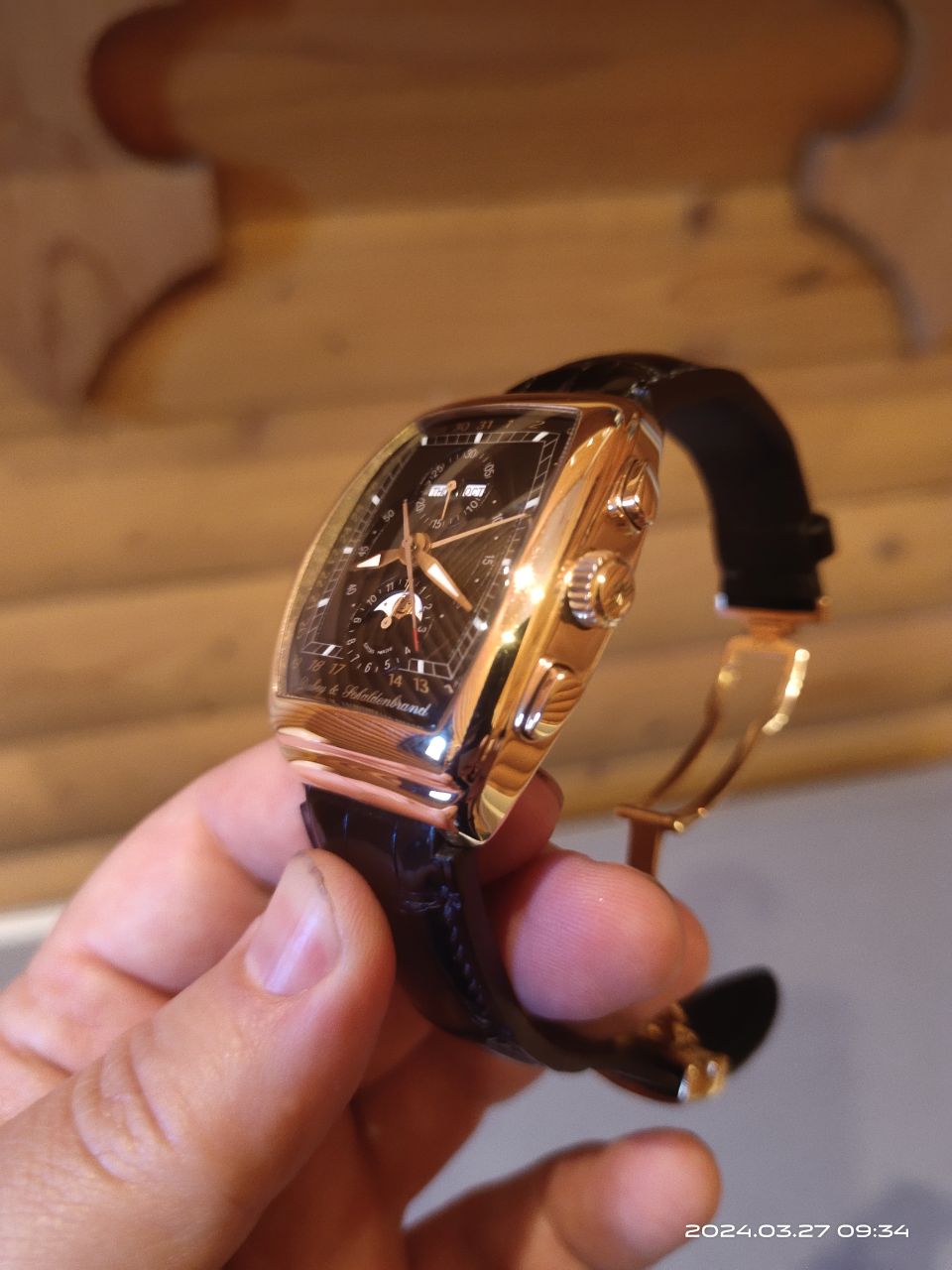 От престижной швейцарской мануфактуры, выпускающей в год не более 5000 уникальных по красоте и высочайшему качеству исполнения часов. Крупные и очень красивые часы в корпусе бочка из розового золота 750 пробы размером 38x50мм на крокодиловом ремне с золотой раскладной застежкой. Потрясающий гильошированный черный циферблат. Автоматическим механизмом, декорированным вручную мастерами мануфактуры можно любоваться через прозрачную заднюю крышку. Очень богатый функционал - дата, день недели, месяц, фаза луны, хронограф. Идеальное состояние. Новый заказной аллигатор в идеальном состоянии. Фирменная раскладная золотая застежка. Общий вес часов 157 грамм. Только золота по лому в часах на 500.000 рублей.