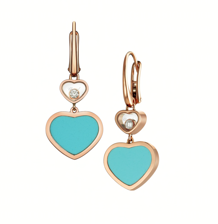 СЕРЬГИ *CHOPARD* HAPPY HEARTS 837482-5410/РОЗОВОЕ ЗОЛОТО/2 ПЛАВАЮЩИХ БРИЛЛИАНТА/ВСТАВКИ ИЗ БИРЮЗЫ