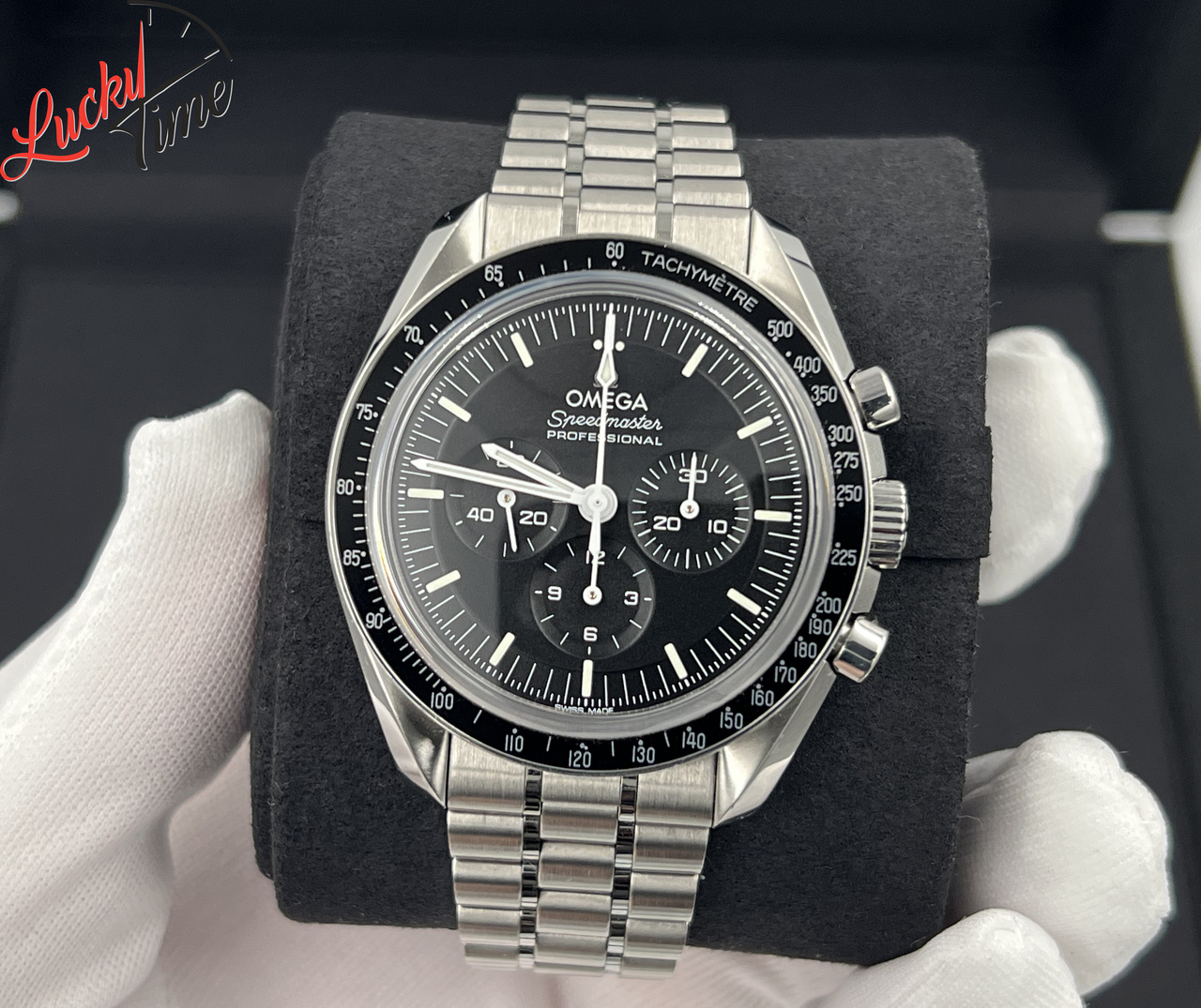 Часы Moonwatch имеют браслет с чередованием матовых и полированных поверхностей, состоящий из пяти рядов цилиндрических звеньев, и корпус из нержавеющей стали диаметром 42 мм. Сапфировое стекло установлено с лицевой и задней стороны корпуса. Дизайн напоминает часы Speedmaster 4-го поколения, побывавшие на Луне. У них асимметричный корпус, черный многоуровневый циферблат с логотипом OMEGA и классическая точка над отметкой 90 на безеле из анодированного алюминия.