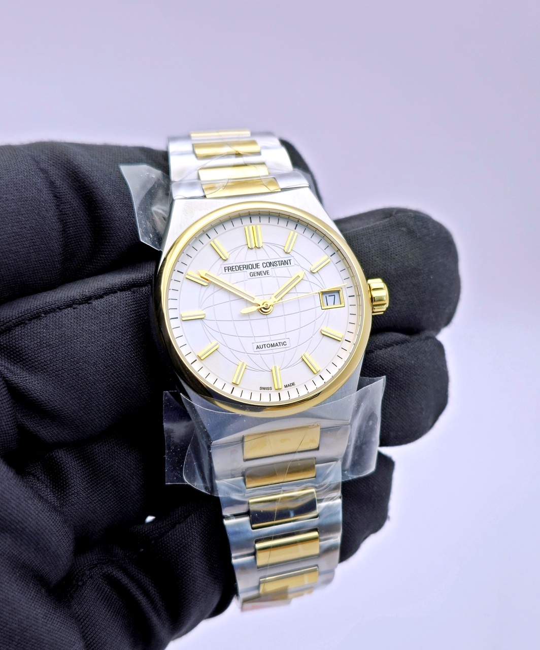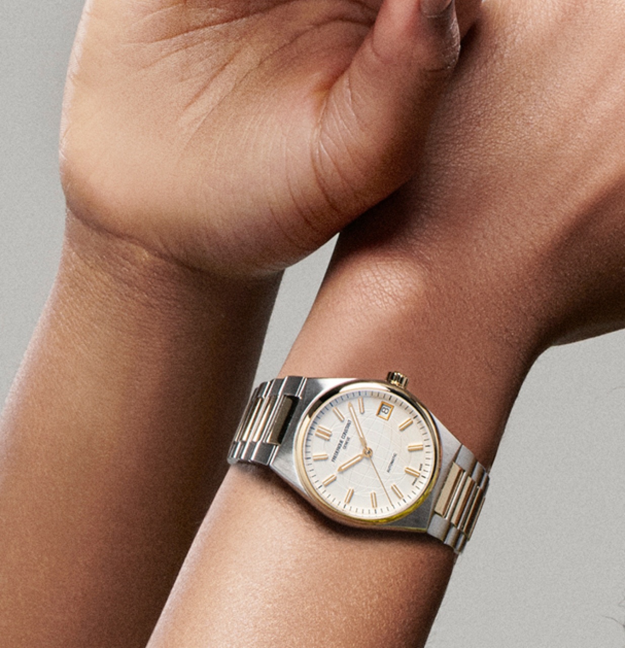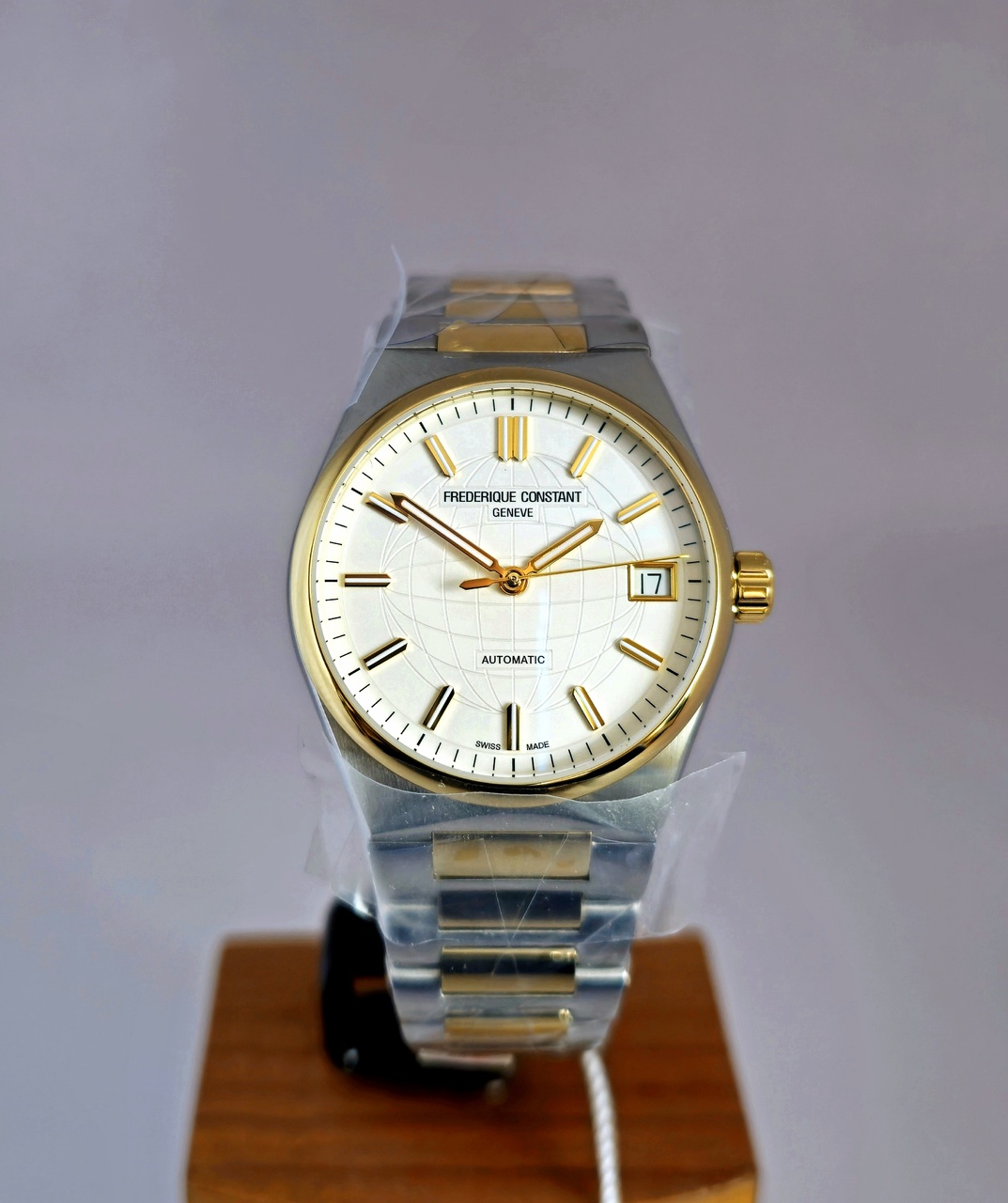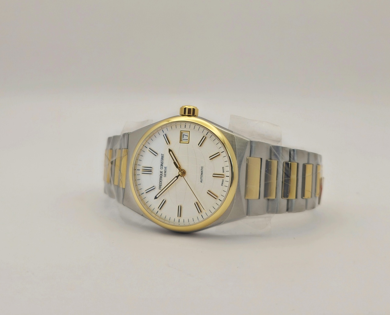 Швейцарские часы Frederique Constant Highlife Ladies Automatic созданы для современных женщин. Модели Highlife Automatic сочетают классический стиль со спортивными элементами и отличаются обновленным дизайном корпуса из нержавеющей стали с частичным золотым покрытием. Циферблат имеет серебристо-белую окраску с шлифовкой "солнечные лучи", гильоширование со стилизованным изображением Земного шара. Накладные часовые индексы и стрелки с золотым покрытием.
