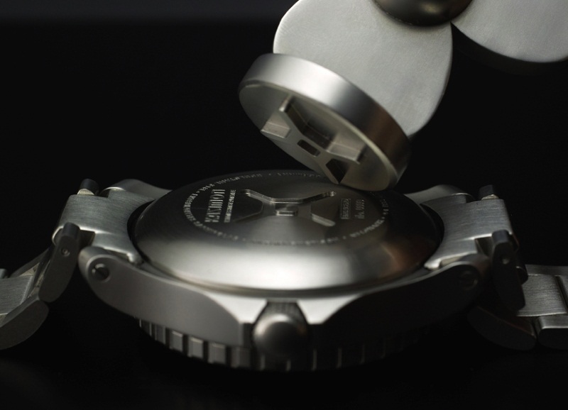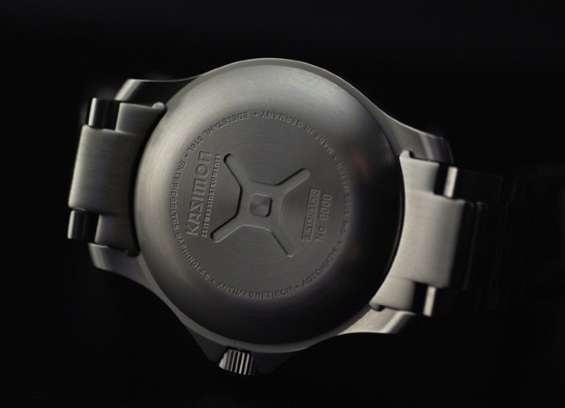 Задняя крышка имеет шлицы в виде эмблемы компании. Даже заводной ключ представлен в довольно интересном варианте: в виде гребного винта. Достаточно массивный корпус диаметром 44 мм выполнен из высококачественной немецкой стали 316L. Ход этого хронометра под водой и не только обеспечивает автоматический механизм ETA 2824-2 на 25 камнях. Модель имеет водонепроницаемость до 1000 метров, которая обеспечивается 3мм выпуклым сапфировым стеклом с антирефексивом, вращающимся безелем с 60 «щелчками» за оборот, мягким внутренним корпусом с защитой от магнитных полей до 80 000 A/m, встроенным в корпус автоматическим гелиевым клапаном. Часы представлены с массивным стальным браслетом. Следует заметить, что наручные часы со всеми своими атрибутами имеют немалый вес. Это достаточно «серьезные» наручные часы для такой молодой марки. Купить часы Kazimon Eintausend можно за 1.500$.