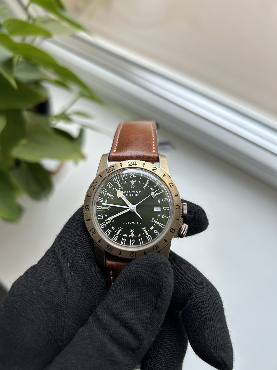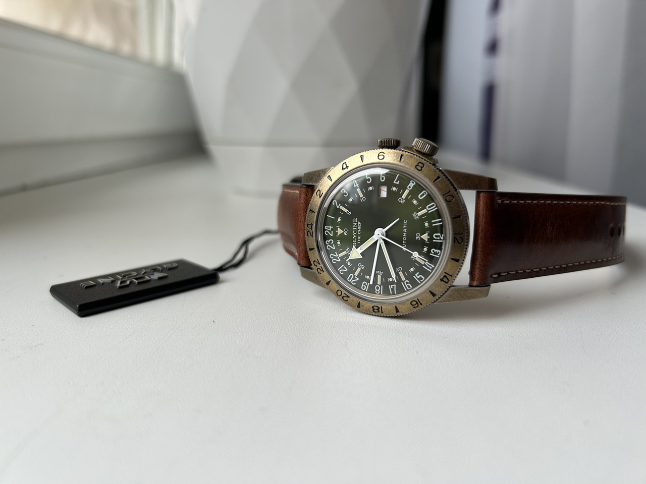 Зеленый циферблат красиво переливается на солнце и идеально гармонирует с цветом корпуса.