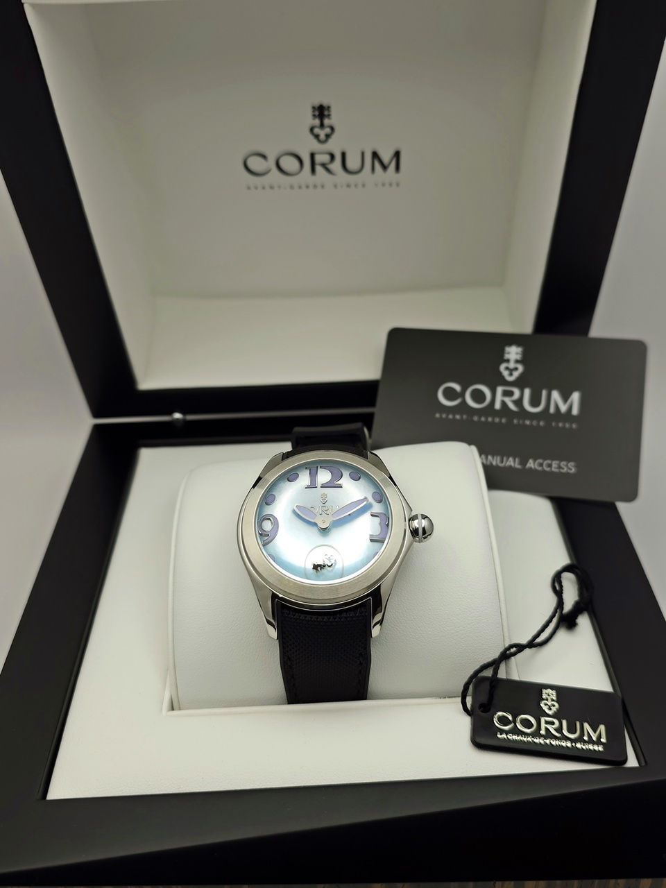 В продаже удобные и в то же время стильные часы для мужчин и женщин. Популярность классических решений в часовой индустрии обусловлена универсальностью линии Bubble от Corum, простотой и представительностью данного стиля. Часы произведены в стальном корпусе размером 42 мм. Толщина часов составляет 16,5 мм с выпуклым сапфировым стеклом. Швейцарский механизм от Frédéric Piguet на 30 камнях с автоматическим подзаводом работает от амплитуды движения руки и обеспечивает запас хода на 72 часа. Часы предназначены для того, чтобы в них спокойно плавали и имеют водонепроницаемость до 100 м. Ремешок, изготовленный из натурального каучука с простой застёжкой из стали, очень удобен в носке и выполнен с перфорацией. Завершает образ необыкновенный голубой перламутровый циферблат и светло-сиреневого цвета люм на стрелках, метках, которые дополняют образ модели.