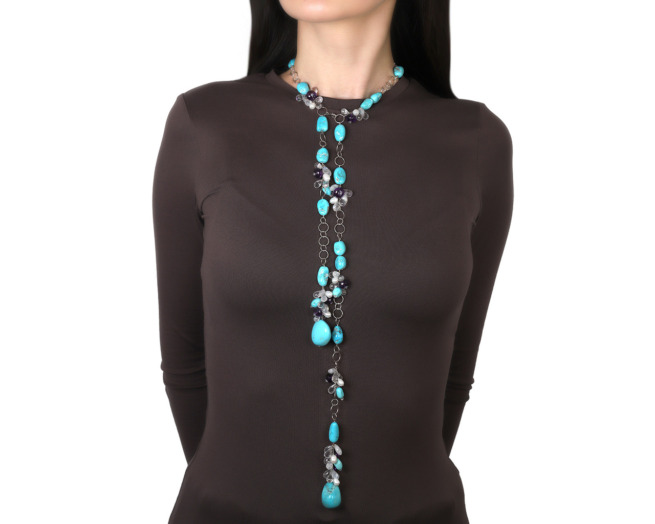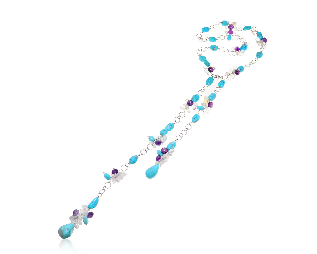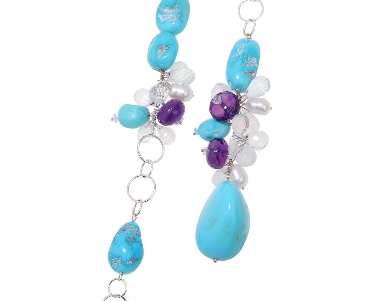 Оригинальное золотое колье с бирюзой 350.40ct, аметистами 91.00ct, горным хрусталем 116.40ct, лунным камней 80.00ct и барочным жемчугом от всемирно известного бренда Paolo Piovan.