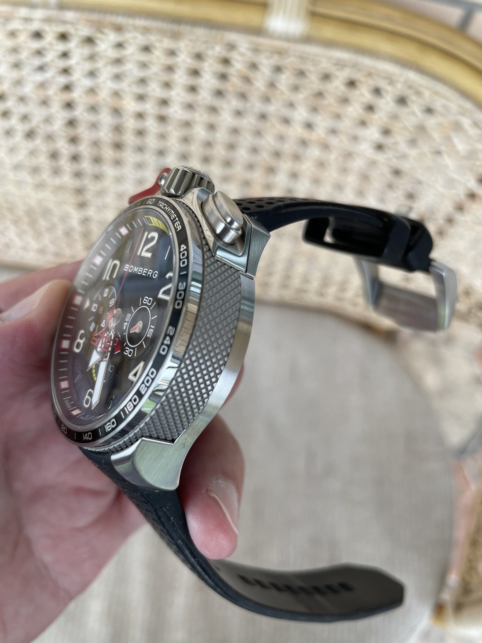В продаже шикарные BOMBERG BOLT-68. Красивейшие часы-трансформер (можно носить на руке или в кармане) с гильоше на циферблате и парижскими гвоздями на корпусе. Диаметр хронографа - 45 мм, ремень- каучук, механизм - неубиваемая Ronda, на циферблате - накладные металлические цифры. Дизайн - просто огонь!!!