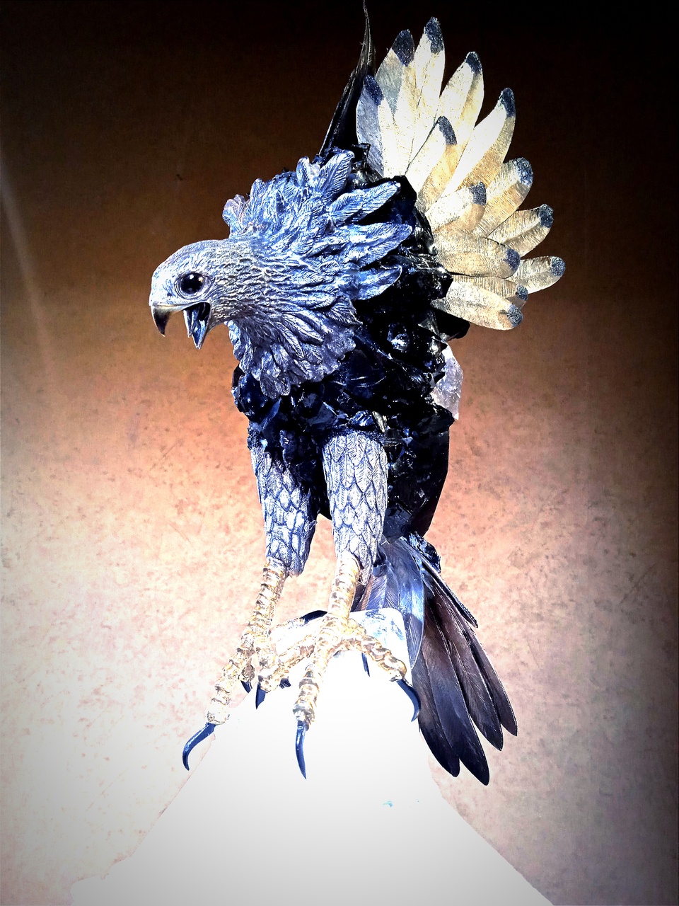 Серебро 875 пробы,вес металла около 2 кг, раухтопаз, горный хрусталь, бразильский агат, обсидиан, золочение 24 карата, покрытие чёрным родием